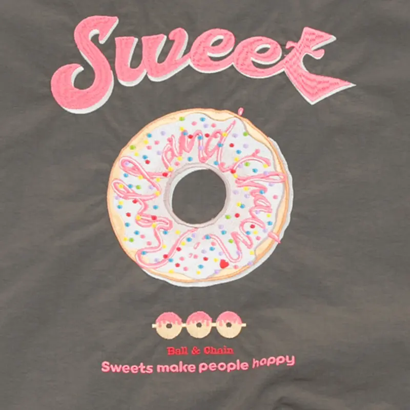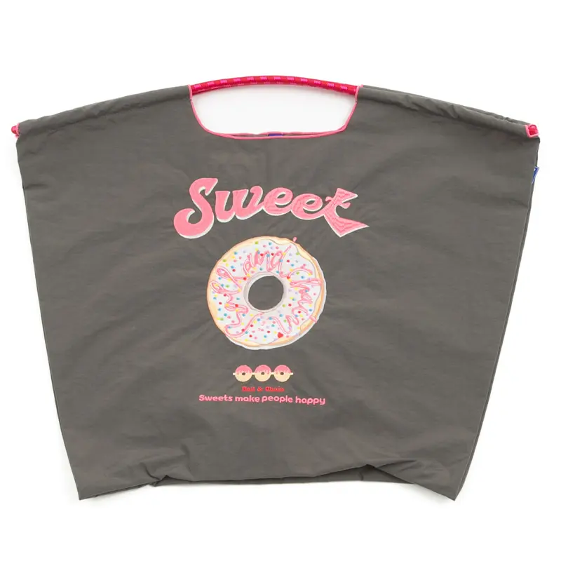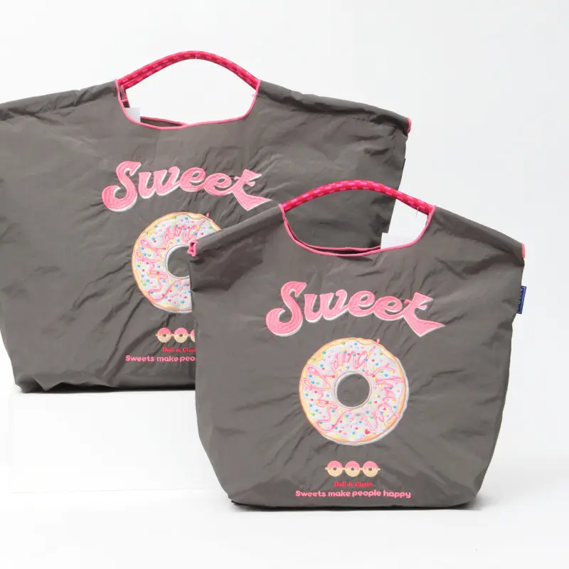 チャコールグレーのナイロンバッグは、カラフルなドーナツ刺繍が映えます。ドーナッツのトッピングがさりげないアクセントとなり、全体をより可愛らしく演出。ポップでキュートなスイーツ柄に、立体的なドーナツトッピングを組み合わせた、見ているだけでもワクワクするエコバッグです。