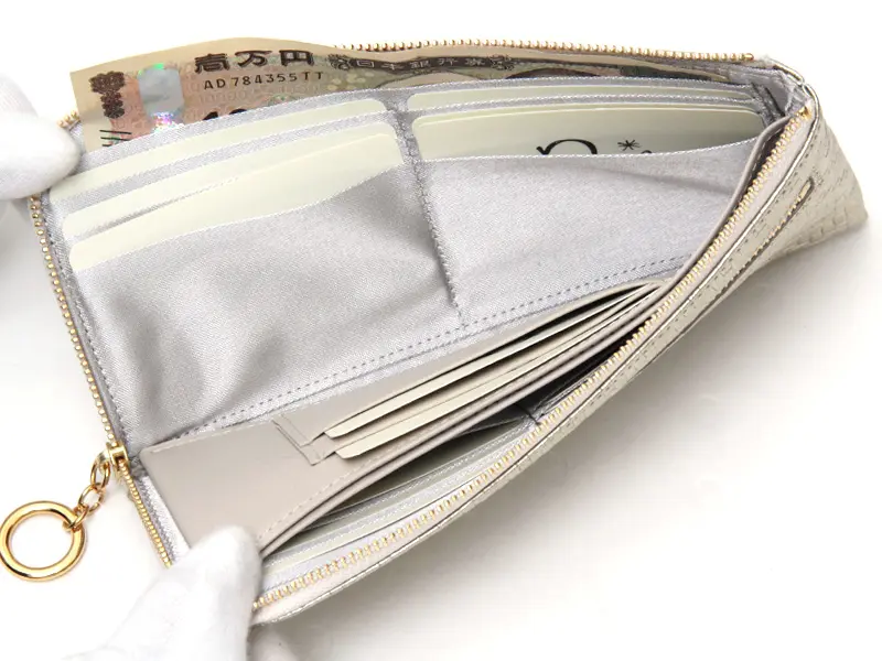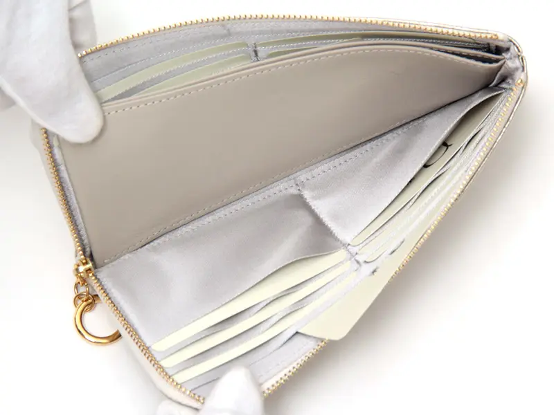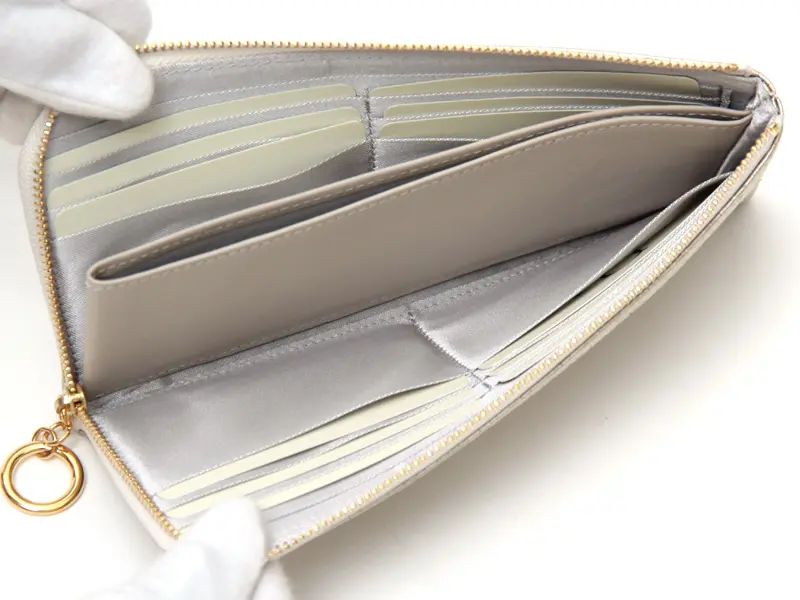 スマートな見た目が魅力のL字ファスナー財布はお財布の中身も一目瞭然です。中央にはオープンタイプの小銭入れが1つ。コインが飛び出さないよう計算された作りになっているので、安心してお使いいただけます。リング状の引き手は、開け閉めがしやすく、デザインのアクセントにもなっています。