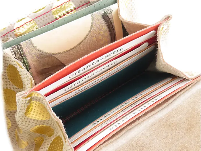 小銭入れの後ろはジャバラ仕様で3つに分かれ、お札が二つ折りで収納できます。カード収納は6か所あり、こちらもポケットごとに異なるカラーリング。アートでキュートな遊び心満載のお財布です。