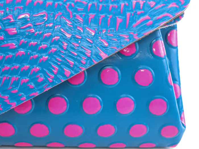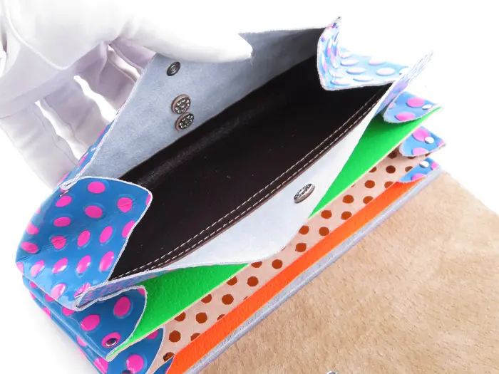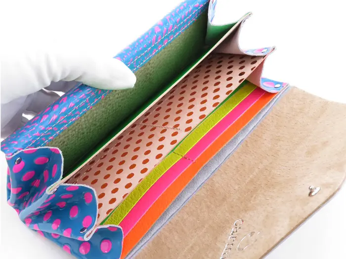 柔らかく軽いピッグスキンとしっかりした質感の牛革を使用。エナメルコーティングを施し、キズや汚れにも強くなっています。カラフルでビビットなドット柄がとてもキュート。他ではない個性的な色使いに思わずトキメク、インパクトのあるcarmineのお財布です。