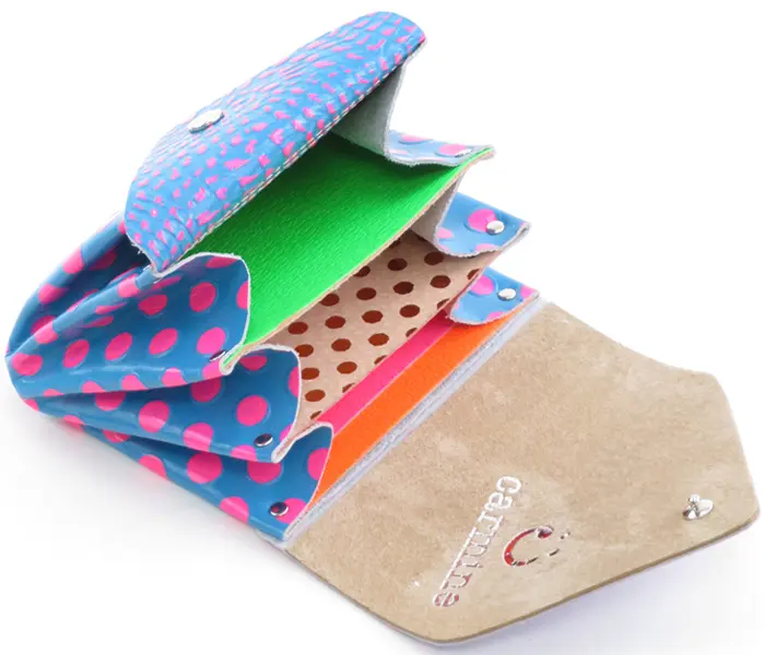小銭入れの後ろはジャバラ仕様で3つに分かれ、お札が二つ折りで収納できます。カード収納は6か所あり、こちらもポケットごとに異なるカラーリング。アートでキュートな遊び心満載のお財布です。