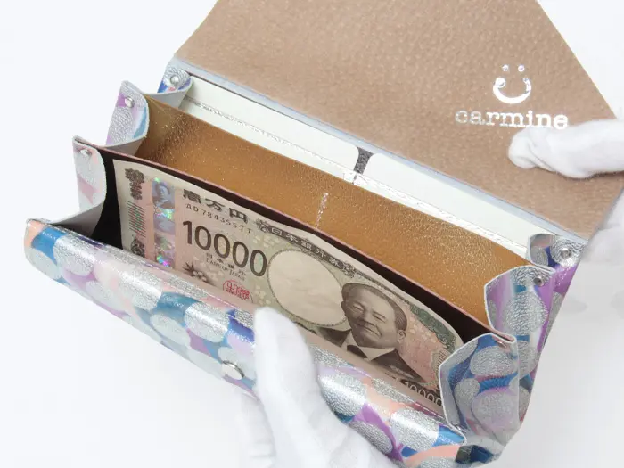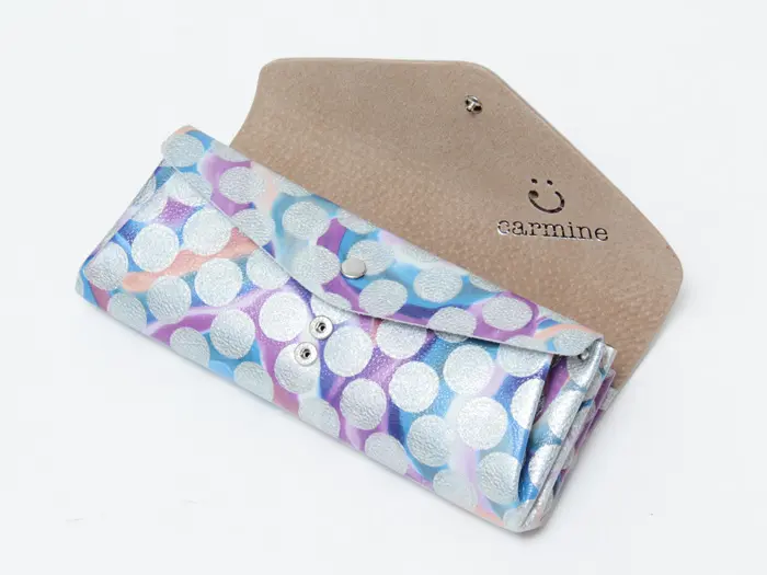 「Enjoy Accessory!」をコンセプトに、アートでキュートなアイテムを展開するMADE IN JAPAN のブランド"carmine カーマイン"。鮮やかな波と輝くドットが重なり合う、芸術的なデザインのウォレット「クリアドット」シリーズが登場。エナメル風のコーティング加工により、お洒落な見た目だけでなく、傷や汚れに強くなっています。シンプルな作りでたっぷり収納でき、使い心地も抜群です。