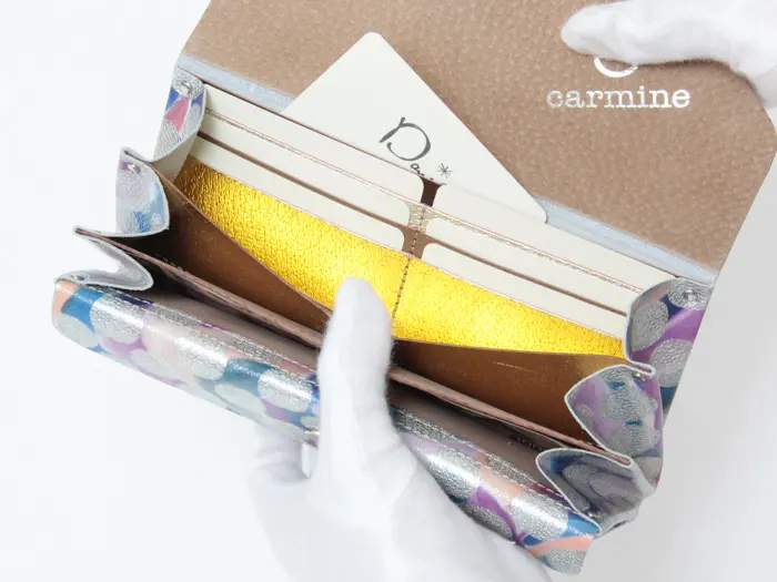 柔らかく軽いピッグスキンとしっかりした質感の牛革を使用。エナメルコーティングを施し、キズや汚れにも強くなっています。鮮やかな波と輝くドットが重なり合う、芸術的なデザイン。他ではない個性的な色使いに思わずトキメク、インパクトのあるcarmineのお財布です。