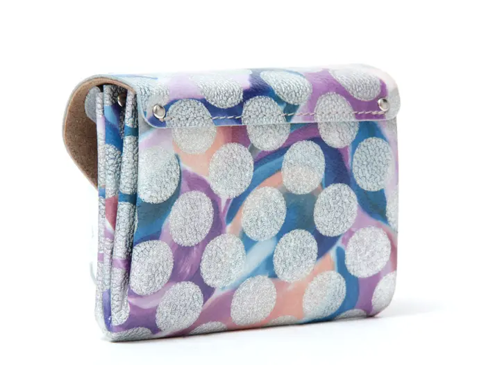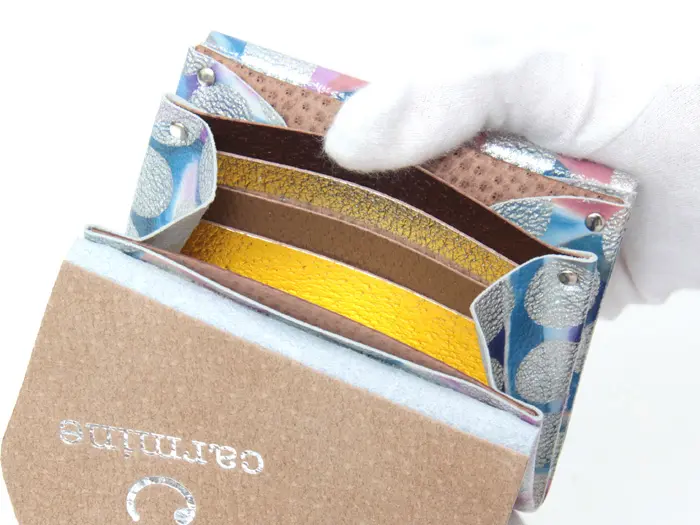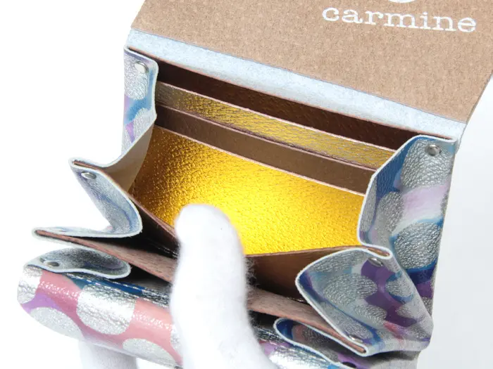 柔らかく軽いピッグスキンとしっかりした質感の牛革を使用。エナメルコーティングを施し、キズや汚れにも強くなっています。鮮やかな波と輝くドットが重なり合う、芸術的なデザイン。他ではない個性的な色使いに思わずトキメク、インパクトのあるcarmineのお財布です。
