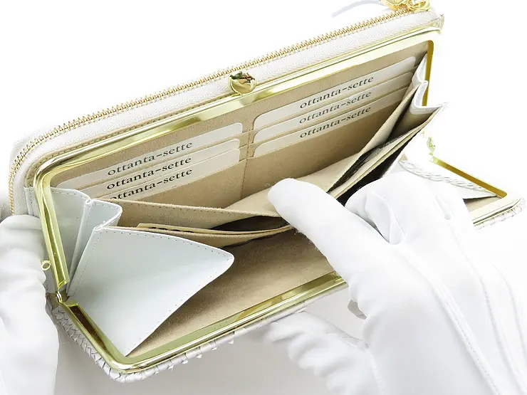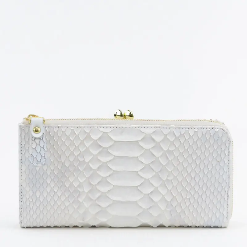 パイソンレザーの優しげなホワイトと淡いパープルの色合いが美しい"Bran Python ブランパイソン"シリーズ。真っ白ではなく、ほんのり紫の地模様を残すことでコントラストがとても綺麗で、ゴールドの金具がエレガントさを増し、女性らしい仕上がりです。見た目の高級感だけでなく、本物の蛇革を使用した金運アップも期待できる縁起の良いサイフです。 L字財布とがま口財布が1つになったロングウォレット。少し大きめで収納力の高さが魅力です。