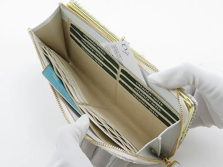 正面はL字ファスナーデザイン、背面はガマ口デザインとなった長財布。収納がそれぞれ分かれており、お財布の中身を綺麗に整頓できます。