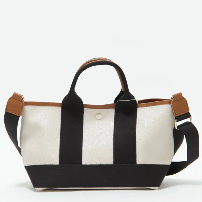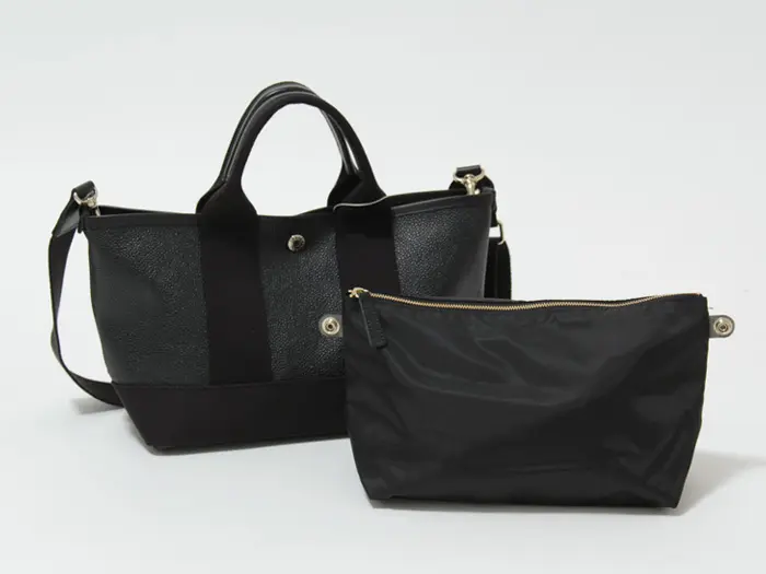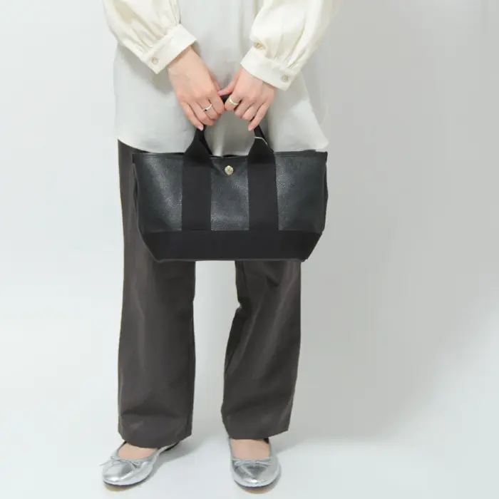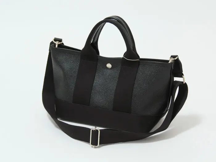 PVCとテープと革、異素材とカラーコンビネーションがおしゃれなトートバッグはオンオフに使える上品かつ洗練されたデザインとなっています。