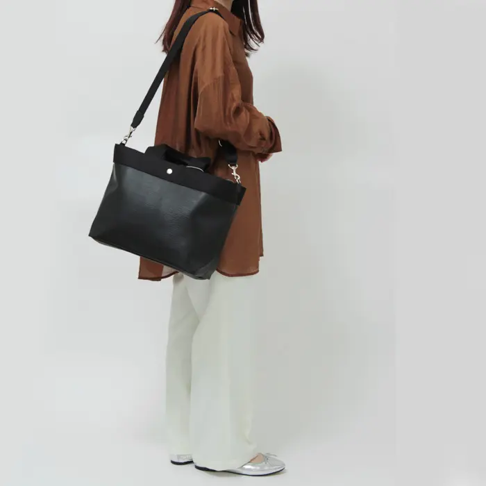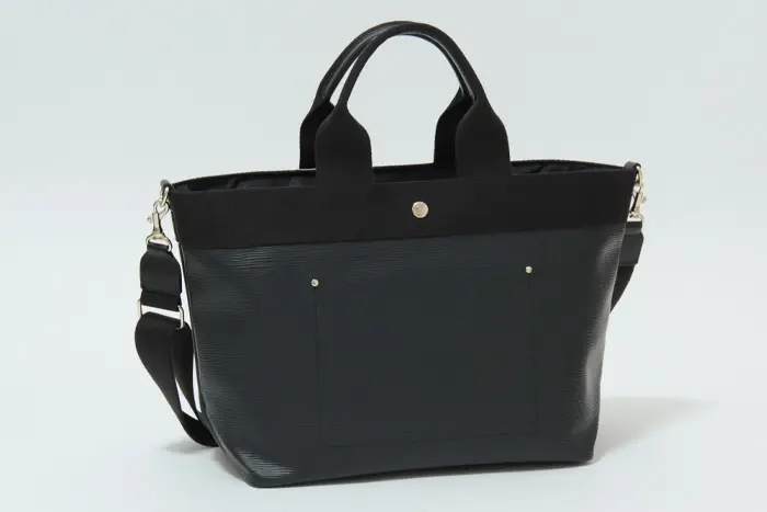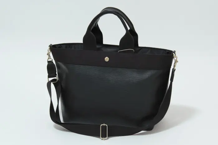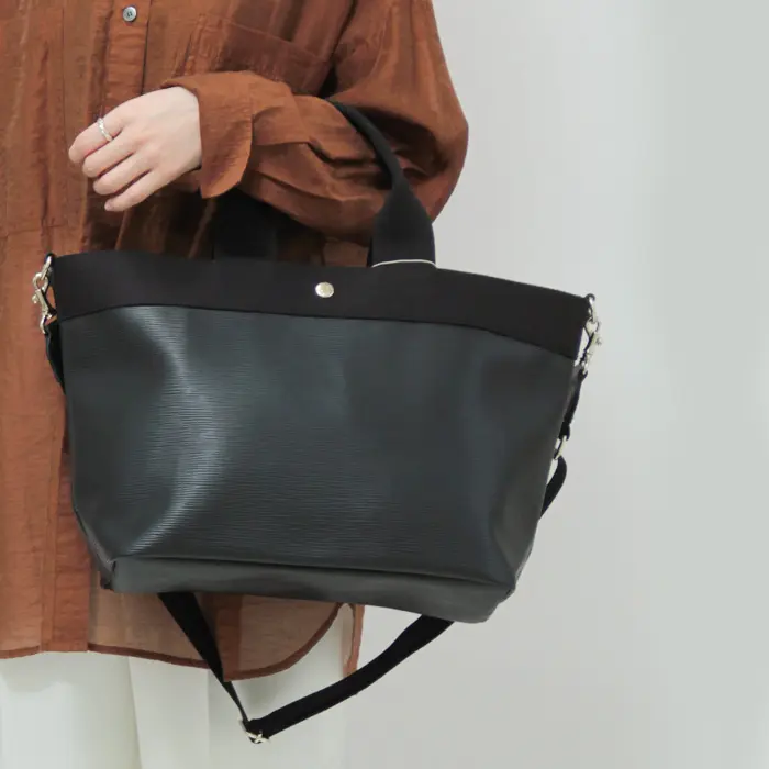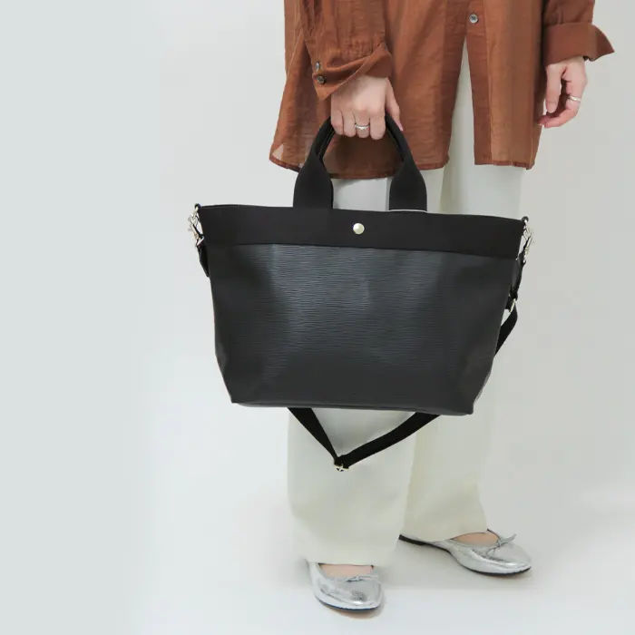 A4サイズ対応の大容量で斜めがけもでき、お仕事バッグやマザーズバッグに最適です。フェイクレザーなので水や汚れに強く、お手入れも簡単。天気を気にせず持てるのも嬉しいポイントです。材料から縫製まですべて日本製にこだわった仕立ての良さも魅力です。