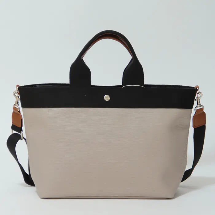 さざ波=Ripple/リプルをイメージし型押しを施した国産のPVCを使用しています。流線がすっきりとしながらも優しい雰囲気で、シンプルなデザインと洗練されたカラーコンビネーションが魅力です。ハンドルと口元にテープを用い、幅広いテイストのお洋服に合う上品な仕上がりです。 PVC素材なので丈夫で劣化しづいため、長くご愛用いただけます。耐久性、耐水性に優れ、汚れに強く、メンテナンスが簡単なのも嬉しいポイントです。