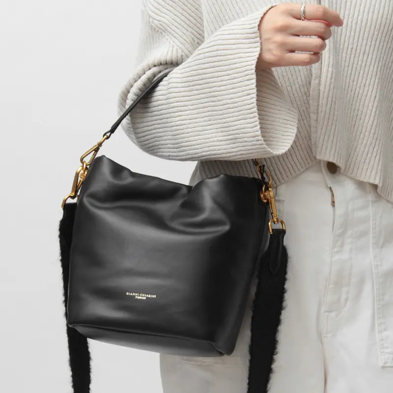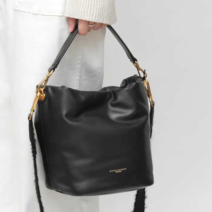 ふっくらと柔らかく仕上げたナッパレザーを使用したGIANNI CHIARINI(ジャンニキアリーニ)の2wayハンドバッグ。上質感漂うシンプルなフォルムに、モヘア素材のショルダーストラップが季節感と温もりをプラス。必要なアイテムをしっかり収納できる実用性も魅力で、ハンドでも肩掛けでも楽しめるデザインです。