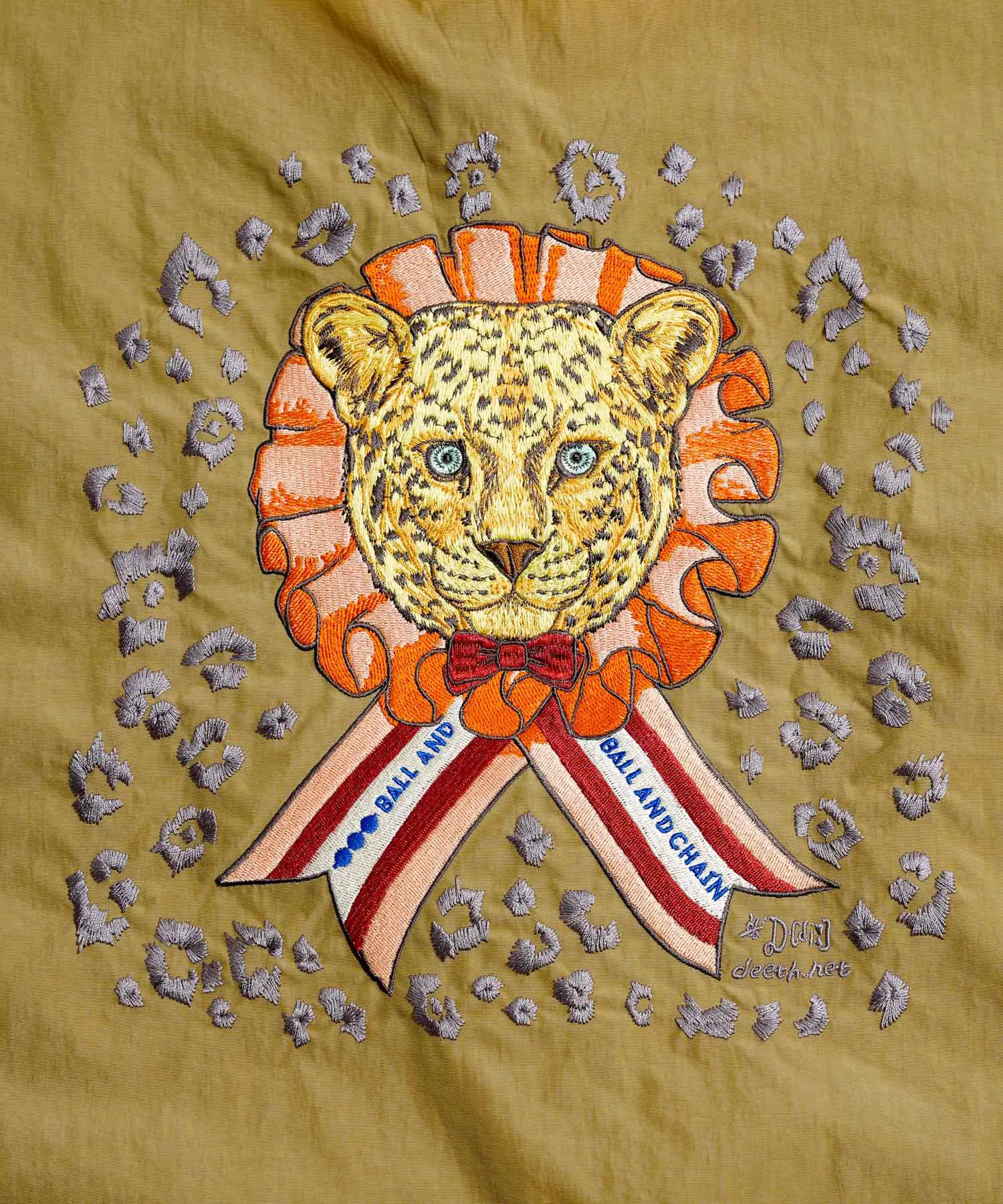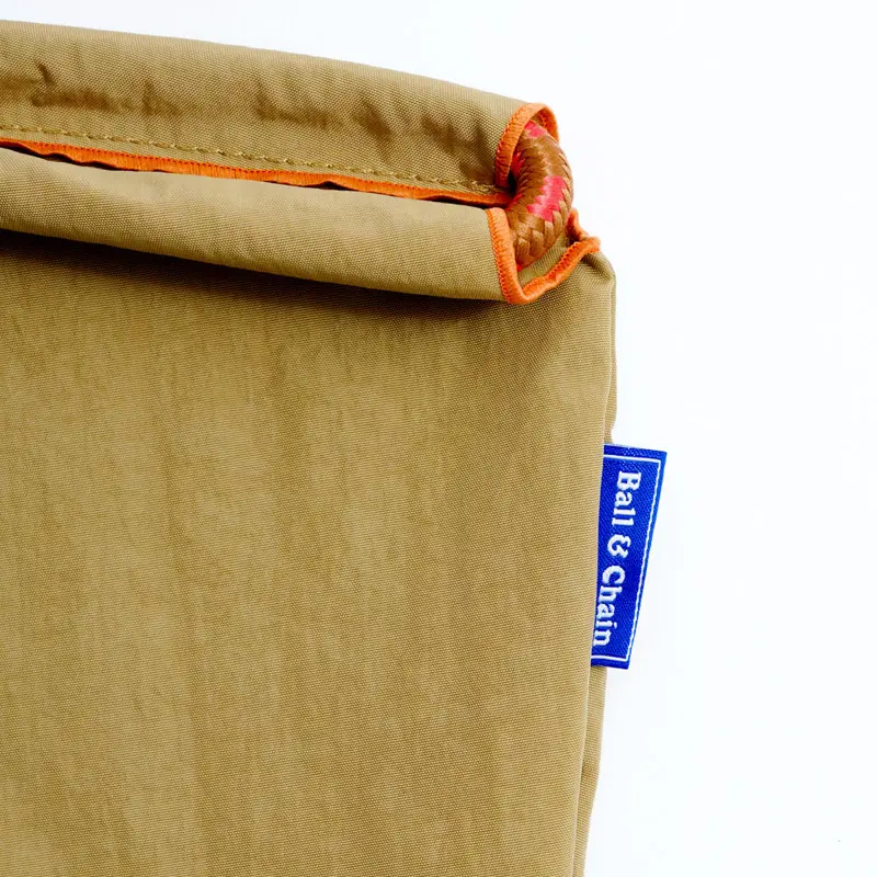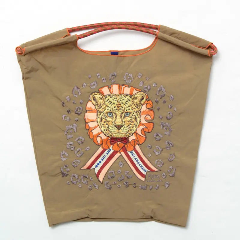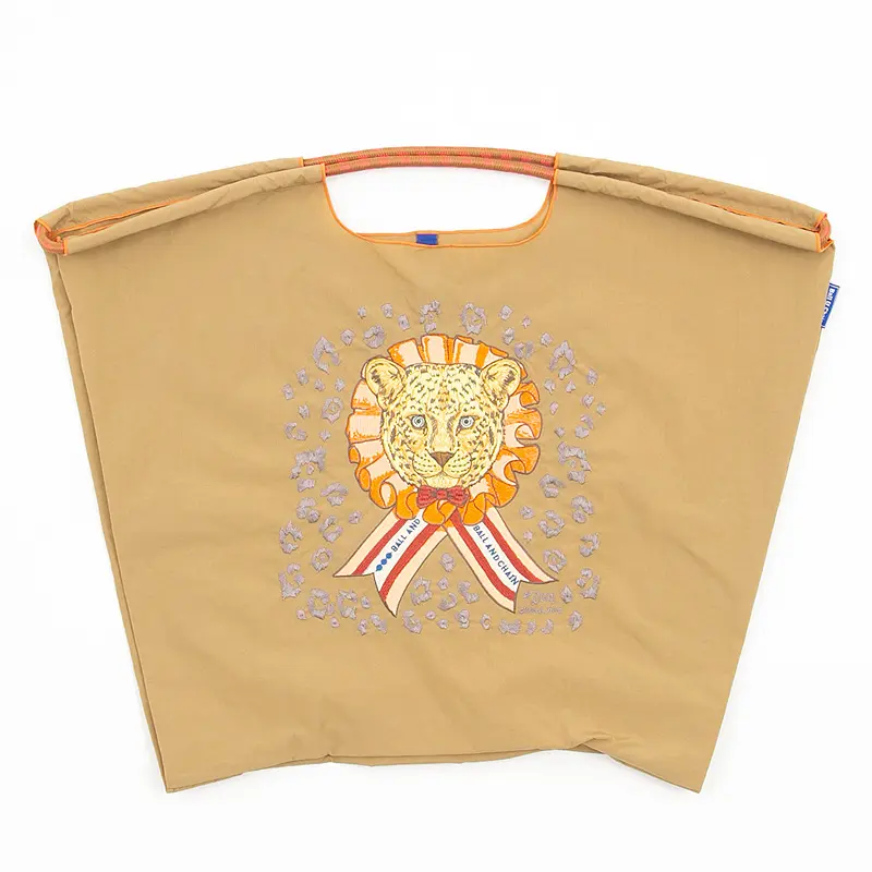 ベージュのナイロン生地に、ヒョウとリボンのモチーフが馴染む、チャーミングなデザインです。さらに、リボン部分にあしらわれた Ball & Chain のロゴが、可愛らしいアクセントとなっているエコバッグです。