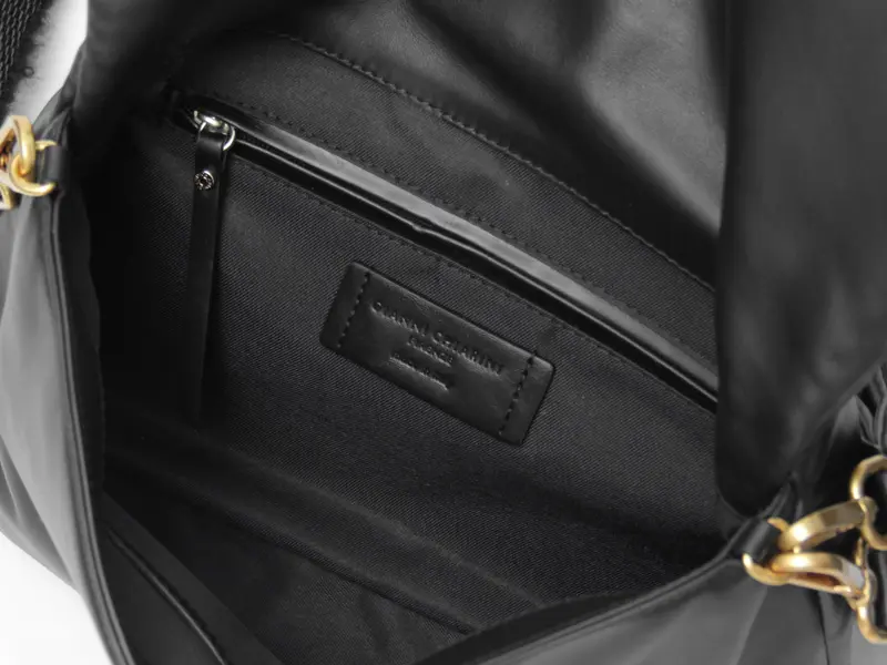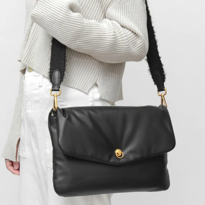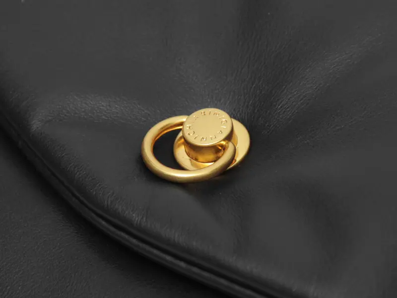 開閉はマグネット付きのフラップ仕様で、片手でもスムーズに操作可能。フロントにはロゴ入りのピアスディテールを施し、さりげない上品さをプラス。薄マチ設計でかさばらず、すっきりとスマートに持てるのも魅力です。