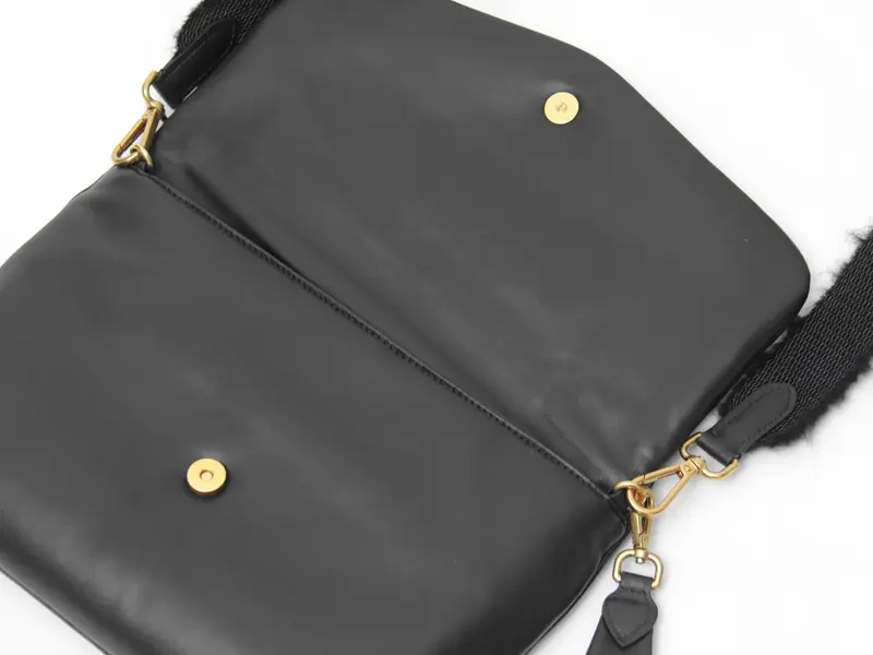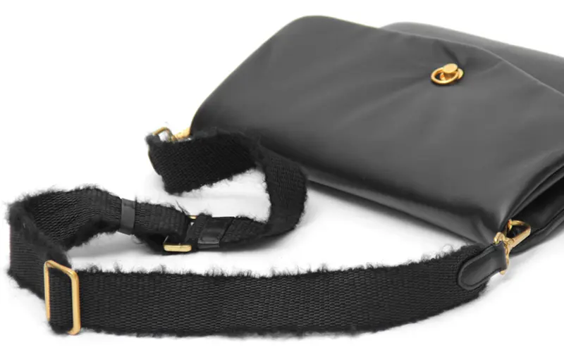 滑らかで、柔らかい肌触りのモヘア素材のショルダーストラップが、秋冬らしさを演出します。幅が4cmと幅広タイプで、肩への負担がかかりにくく、長時間の使用でも痛くなりにくい仕様です。