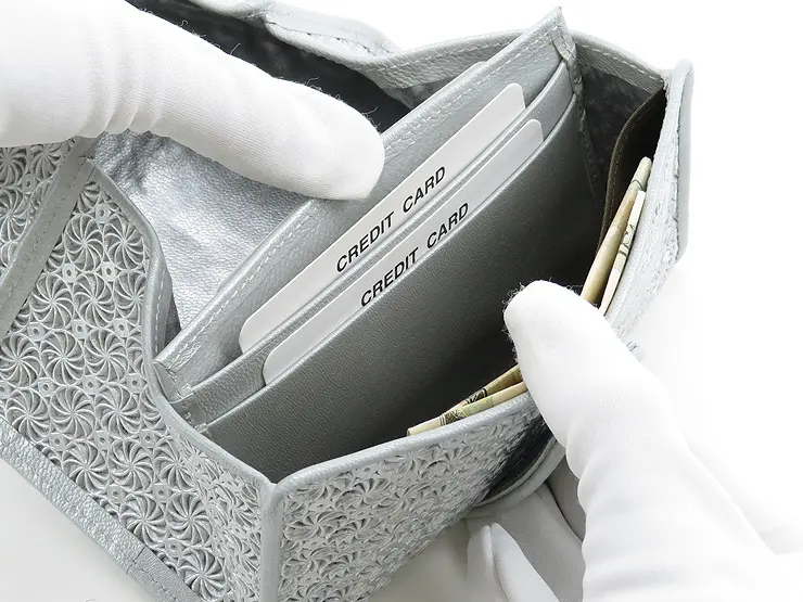 カード収納が計5ヶ所あります。幅が少し広めとなっており1ヶ所に2~3枚程度入るので全部で15枚程度は収納可能です。お札収納は2ヶ所あり、紙幣を二つ折りにして入れていただけます。コンパクト財布ですがメインの財布としても十分お使いいただけます。家計用や旅行用などセカンド財布にもおすすめです。