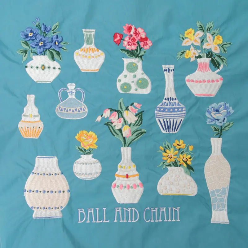 ターコイズブルーのナイロンバッグに、色とりどりのお花が美しく映えます。それぞれ表情の異なるフラワーベースには、細部までこだわりが詰まっています。多彩な配色ながらも上品な印象に仕上げたエコバッグです。