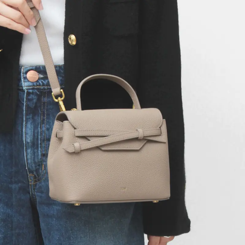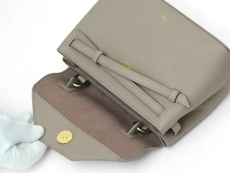 光沢を抑えたサラッとした質感でシボの効いた牛革は上質感が漂います。正面にあしらったクロスリボンは甘すぎず女性らしい印象をプラスしてくれます。