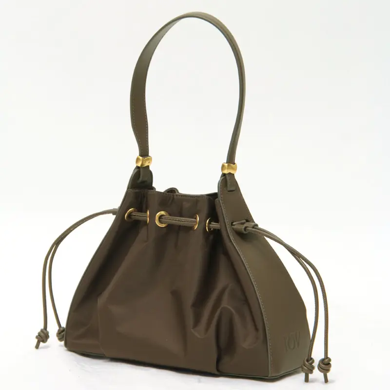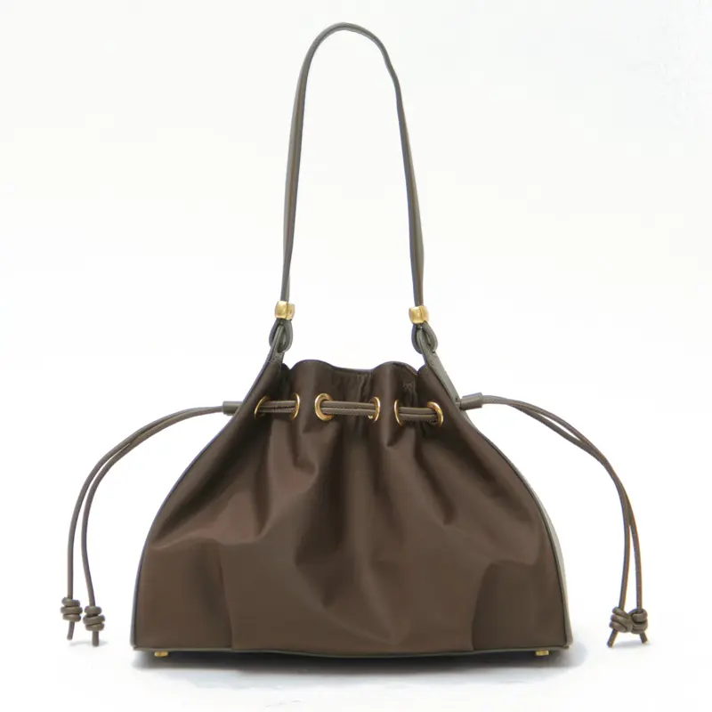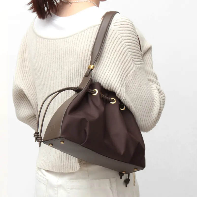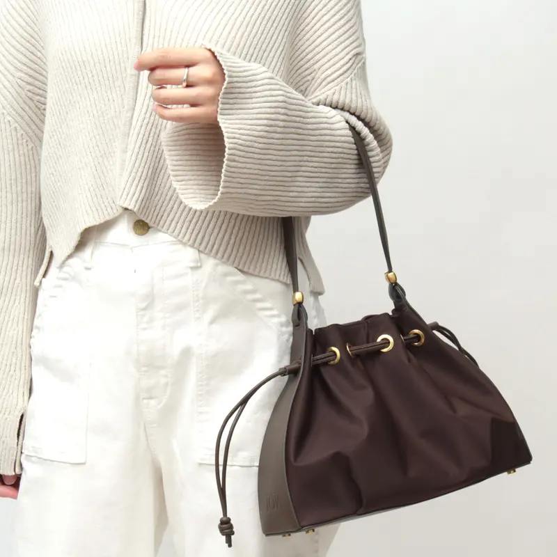 高級感を演出するレザーのハンドルは手馴染みも良い仕様です。長めのワンショルダーデザインなので肩掛けでもお楽しみいただけます。肩掛けで持った際に小脇にスッキリ収まるサイズ感で、フォルムが美しく見えるようにデザインされています。