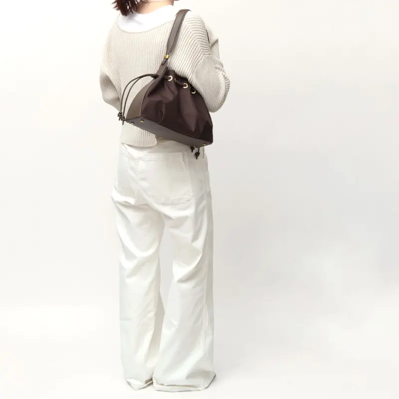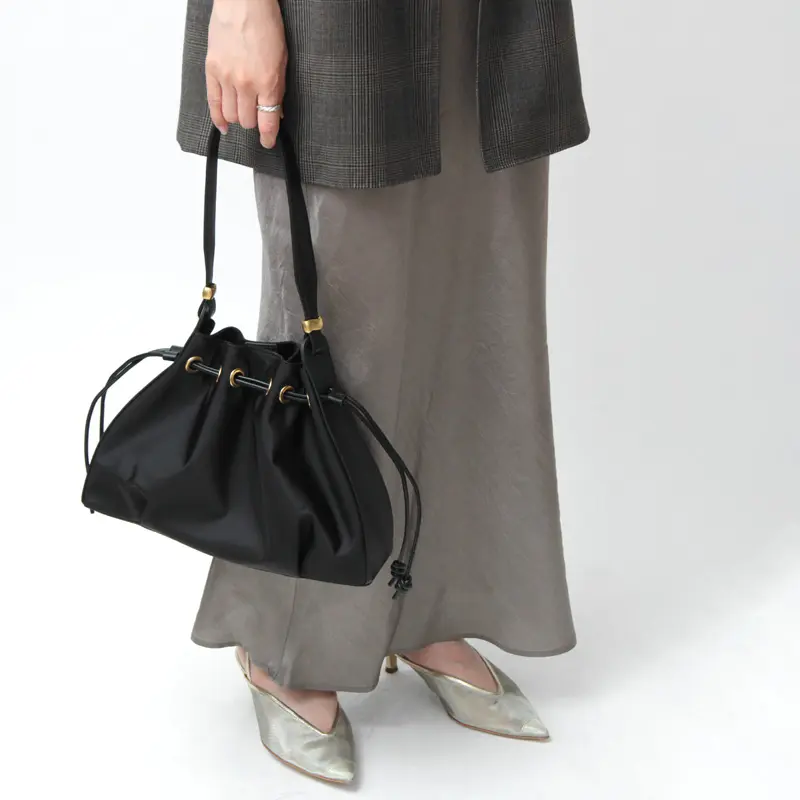 開閉口はマグネット付きで、荷物の量に合わせて絞っても、絞らずにそのまま閉じても使える2WAY仕様。コンパクトながら長財布などの必需品に加えて、500mlのペットボトルや眼鏡ケースなど必需品+αの荷物が収まるサイズ感。程よくマチ幅があるので見た目以上に荷物が入り、しっかり入れてもスッキリお持ちいただけます。