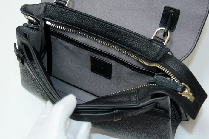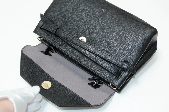開閉はマグネット付きのフラップとファスナー仕様で防犯面も安心です。ミニ財布やキーケース、スマホ、エコバッグなど必要最低限の荷物がまとまります。リップなどの小物が収納できる内ポケット付きです。内側の素材はスエード調の人工皮革を使い、高級感を漂わせます。