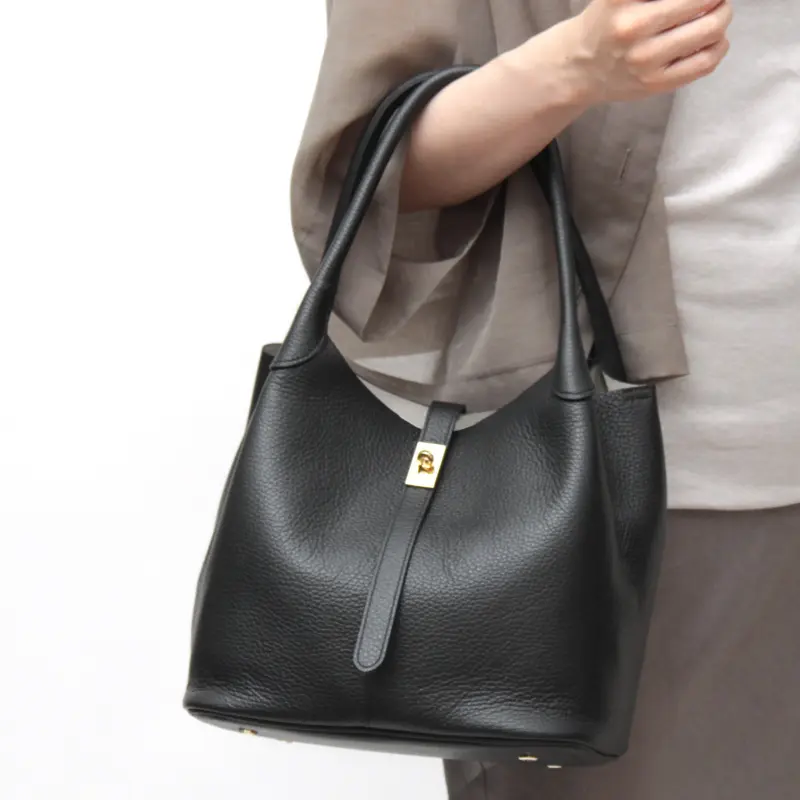 開閉はひねり金具のターンロック付きベルト仕様で安心感のある設計。広めのマチで長財布やポーチなどの必需品がゆったり収納可能。内側のスナップボタンを外せば、B5サイズがぴったり収まり、用途に応じて使い分けられる実用的なデザインです。
