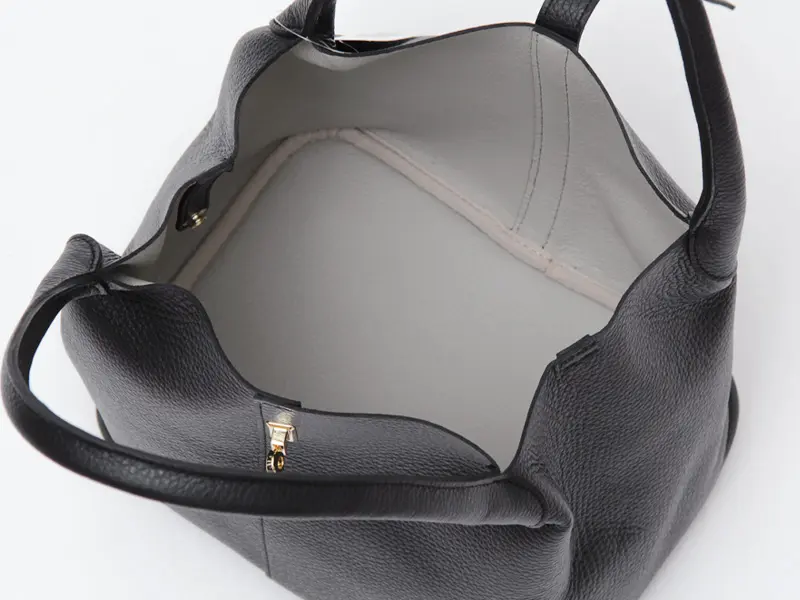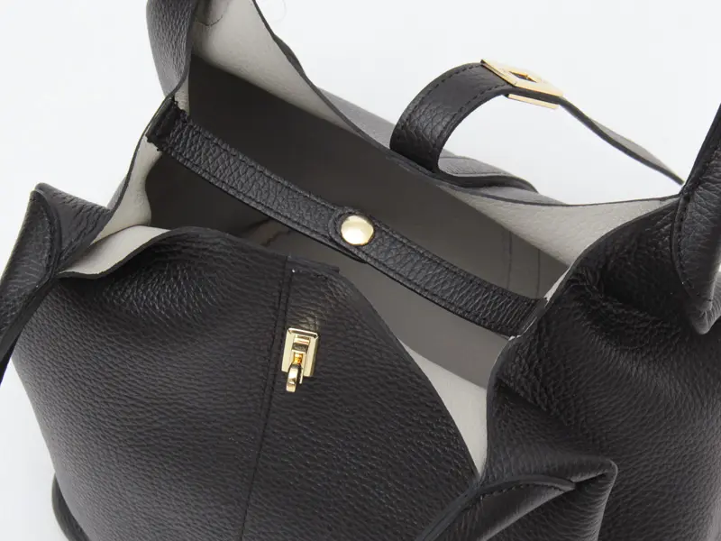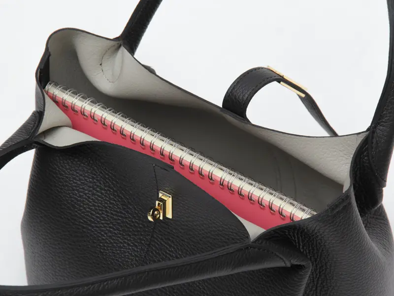 素材には、イタリア・POLETTO社の型押しWフェイスレザーを使用。傷が付きにくく、しなやかで柔らかな風合いが特徴です。裏地を省き内側にカラーを施すことで、軽さと高級感を両立。細かなシボが美しく、洗練された印象を与えてくれます。