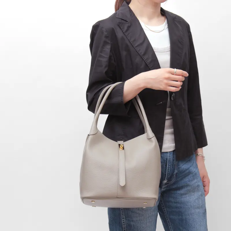 お出かけや通勤に便利な長めの丸手ハンドルは、女性の手にフィットする程よい太さと厚みが特徴。持ちやすく、しっかりとした強度も備えています。薄手のジャケットの上からでも肩掛けできる長さで、使い勝手も抜群です。