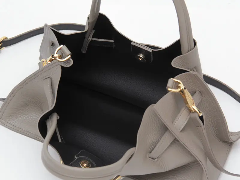 素材には、イタリア・POLETTO社の型押しWフェイスレザーを使用。傷が付きにくく、しなやかで柔らかな風合いが特徴です。裏地を省き内側にカラーを施すことで、軽さと高級感を両立。細かなシボが美しく、洗練された印象を与えてくれます。