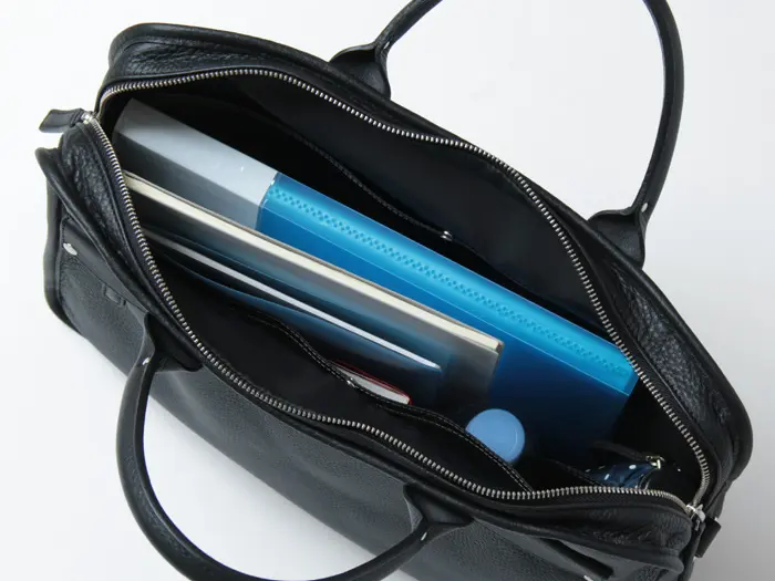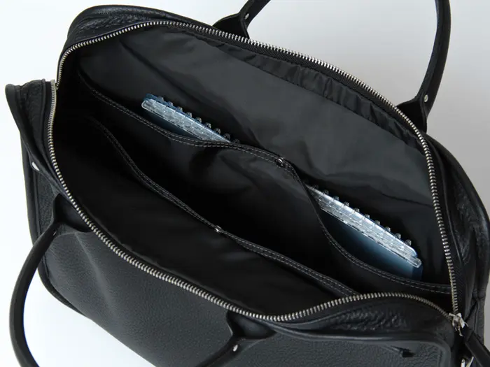 開閉はダブルファスナー仕様で、大事な書類も安心して持ち運びができます。メイン収納はB4サイズが収まる大きさで、A4サイズのノートなら縦向きにも収納可能。マチ幅があるのでビジネスツール+ペットボトル等も入る大容量で、出張やビジネスシーンに最適です。