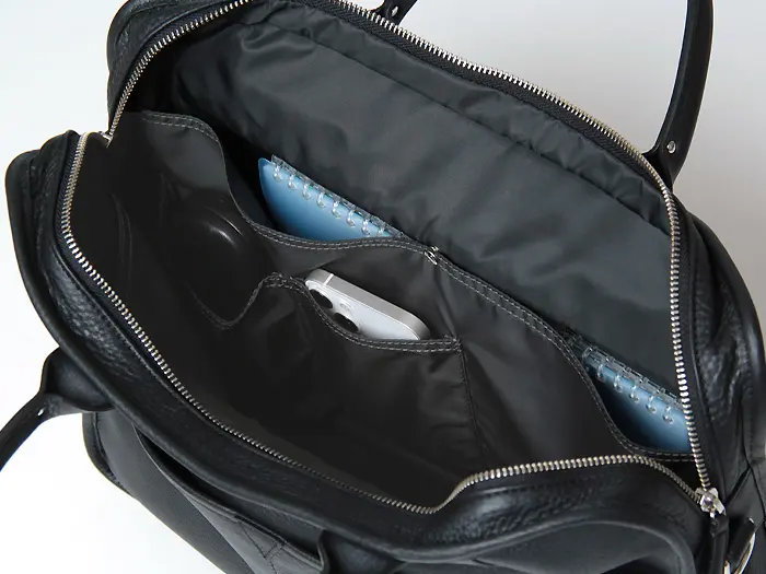 内側両側面に財布やタブレットなどを整理して収納できる大ポケットが2つあり、大ポケットの片側には眼鏡ケースやスマホ等の小物の収納に適した2つの小ポケットが備わっています。