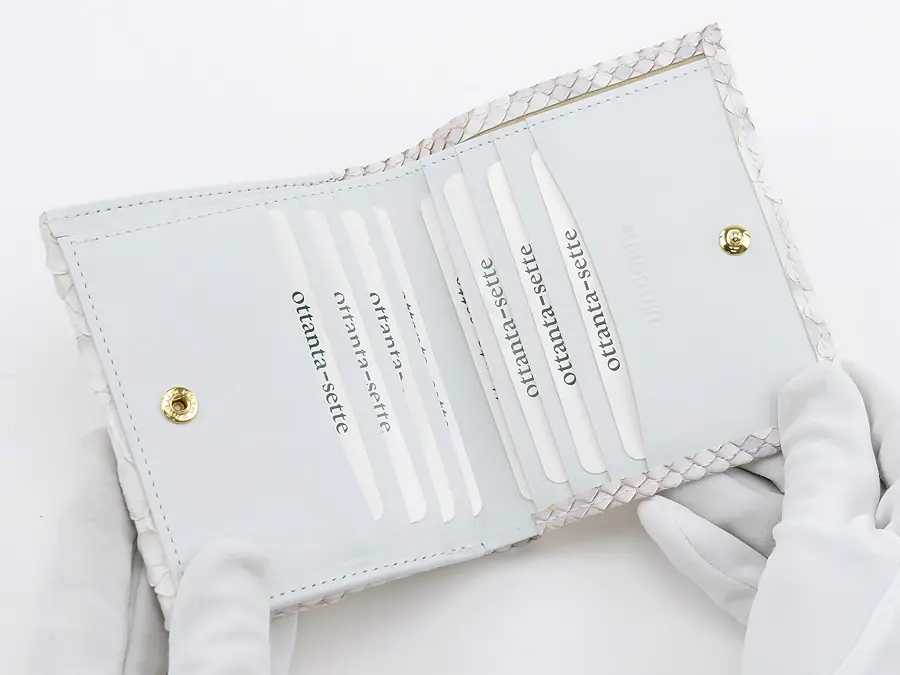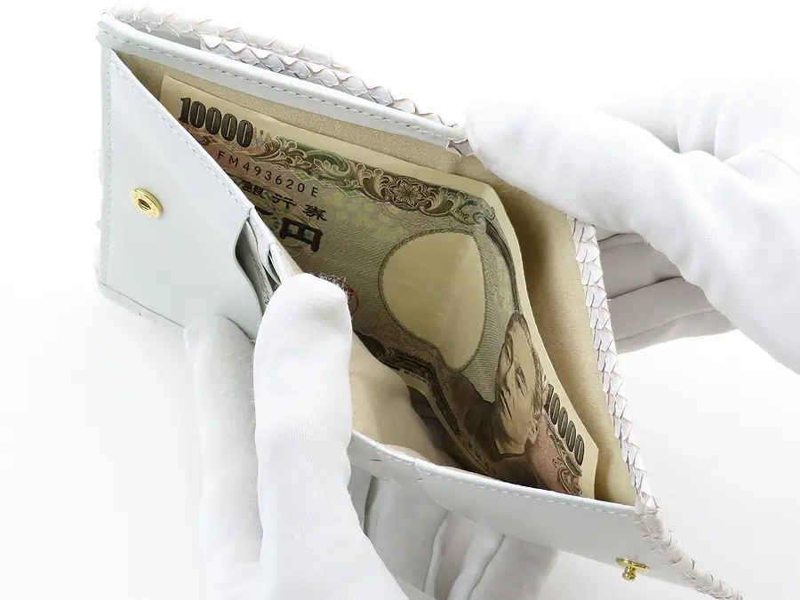 パイソンレザーの優しげなホワイトと淡いパープルの色合いが美しい"Bran Python ブランパイソン"シリーズ。真っ白ではなく、ほんのり紫の地模様を残すことで、コントラストがとても綺麗で女性らしくフェミニンな仕上がり。見た目の高級感だけでなく、本物の蛇革を使用した金運アップも期待できる縁起の良いサイフです。