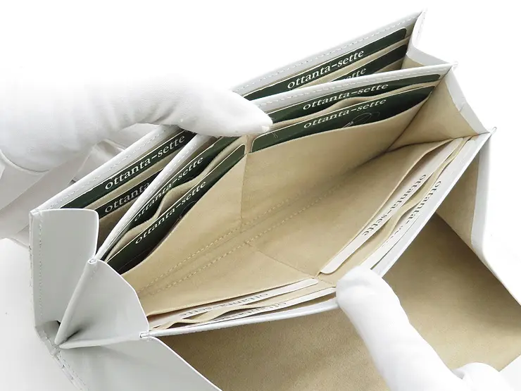 パイソンレザーの優しげなホワイトと淡いパープルの色合いが美しい"Bran Python ブランパイソン"シリーズ。真っ白ではなく、ほんのり紫の地模様を残すことで、コントラストがとても綺麗で女性らしくフェミニンな仕上がり。見た目の高級感だけでなく、本物の蛇革を使用した金運アップも期待できる縁起の良いサイフです。