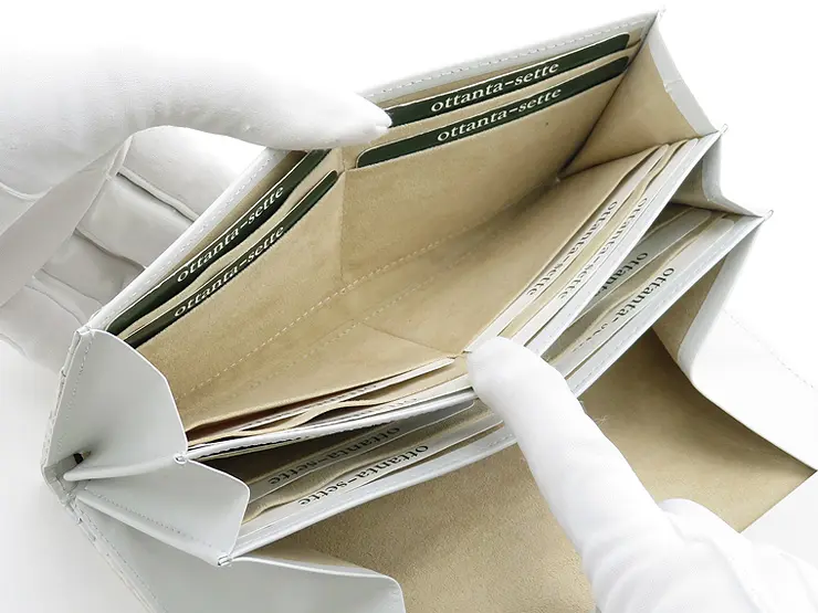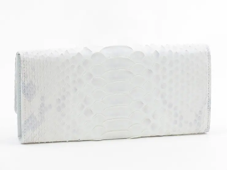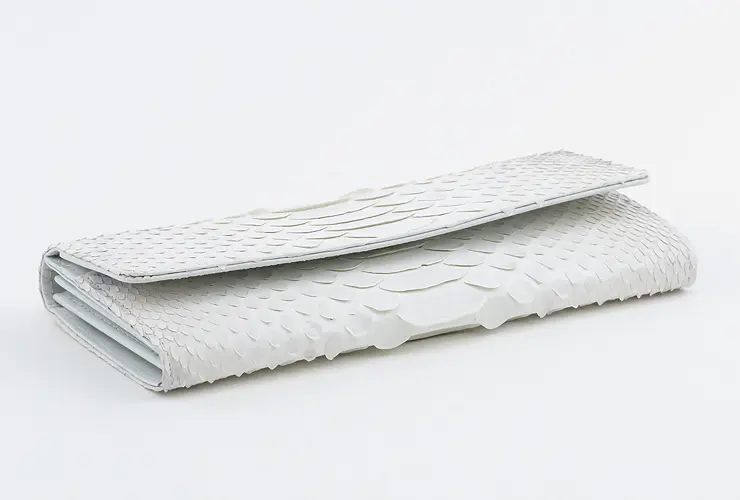 bran python/ブランパイソンシリーズは、淡い紫の天然の地模様を残すよう、ハーフブリーチ加工を施したニシキヘビの皮を使用しています。地模様を活かしながら白を何度も薄く塗布し、深く繊細な色のトーンが生み出されています。 蛇のウロコは魚のように剥がれることなく、一枚の革として繋がっているので大変強度があり、丁寧に扱っていただければ長くご愛用いただけます。