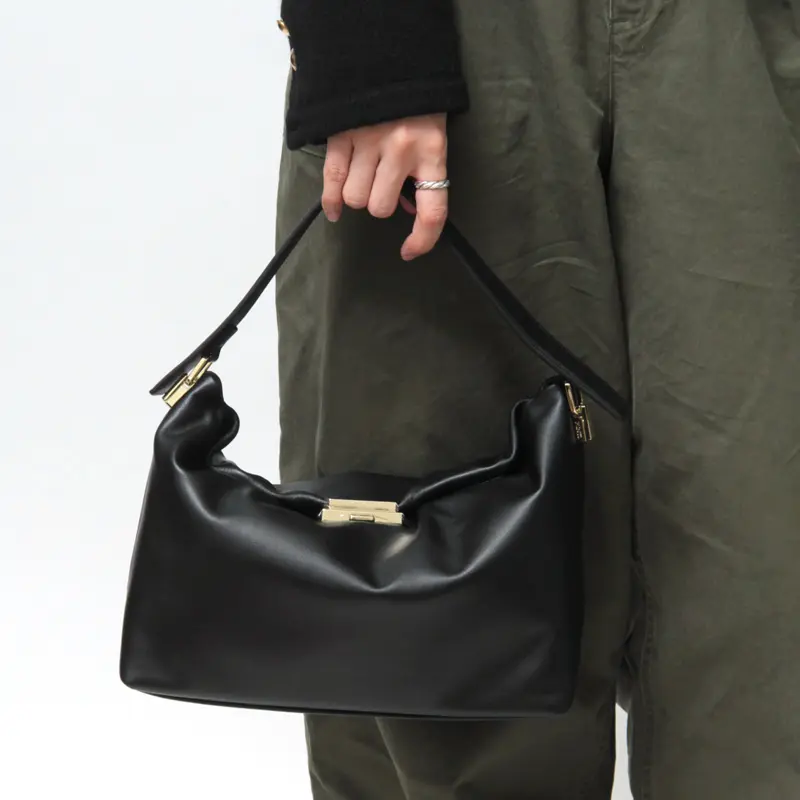 柔らかな牛革スムースレザーを使用し、上品な風合いを楽しめるPUNTI.(プンティ)の「GRAFT」シリーズ。口元にはブランドオリジナルの金具があしらわれ、エレガントな雰囲気を際立たせます。ハンドル金具は、ショルダーを外した状態でも美しく見えるようデザインされており、クラッチバッグとしてもスマートに持てる仕様。洗練されたデザインと実用性を兼ね備えた、日常に寄り添う万能バッグです。