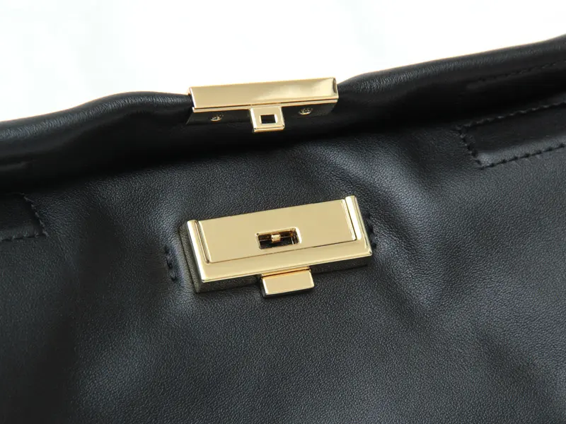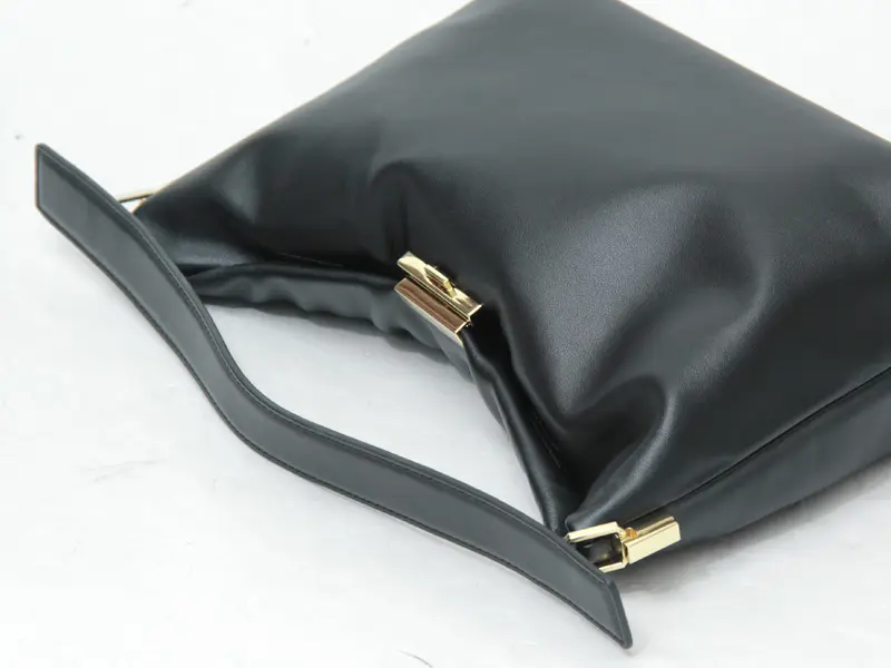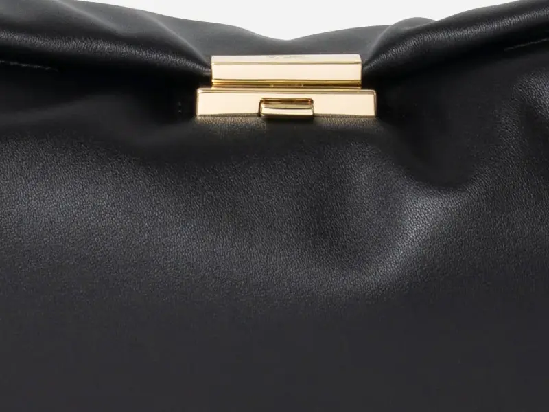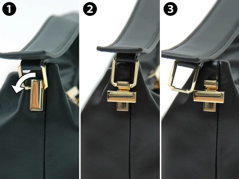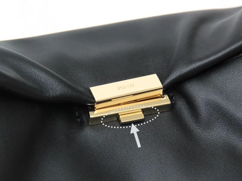 矢印方向に押すと金具が開く仕様です。ワンタッチで開閉しやすい口元のオリジナル金具が、上品で洗練された印象を添えます。