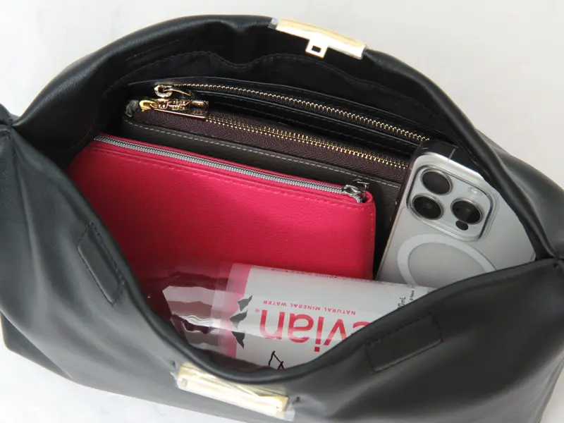 長財布など普段お出かけの際の必需品に加え、500mlペットボトルも収まります。内側にはオープンポケットやファスナーポケットが1つあり、スマホや定期など小物の収納に便利です。