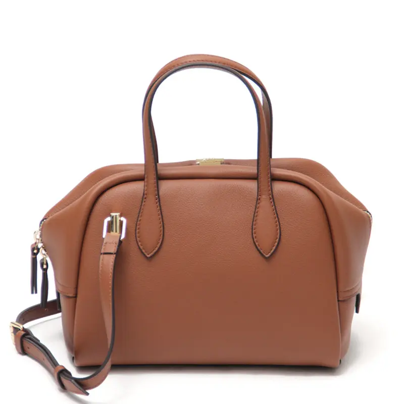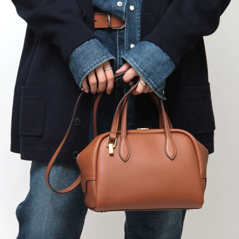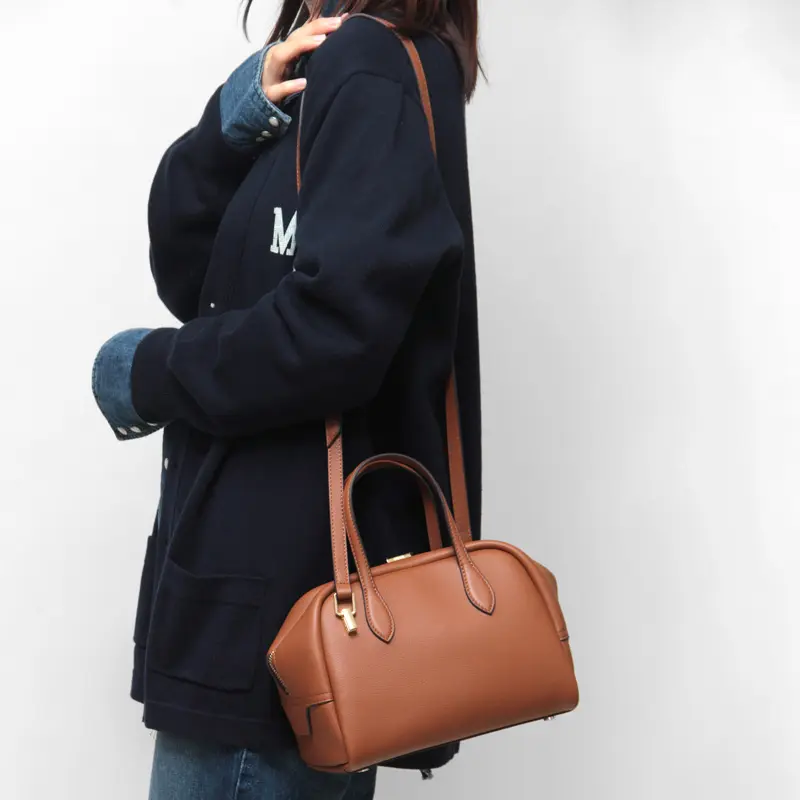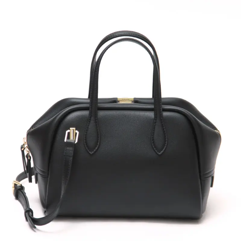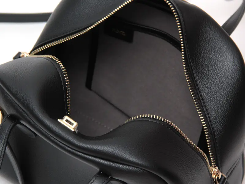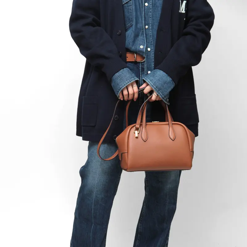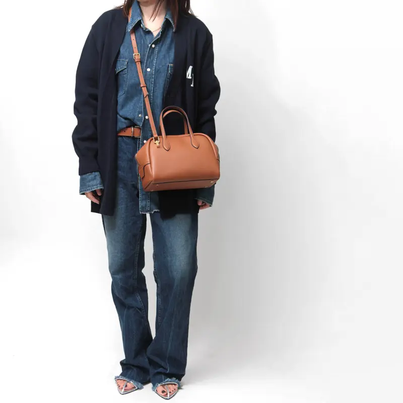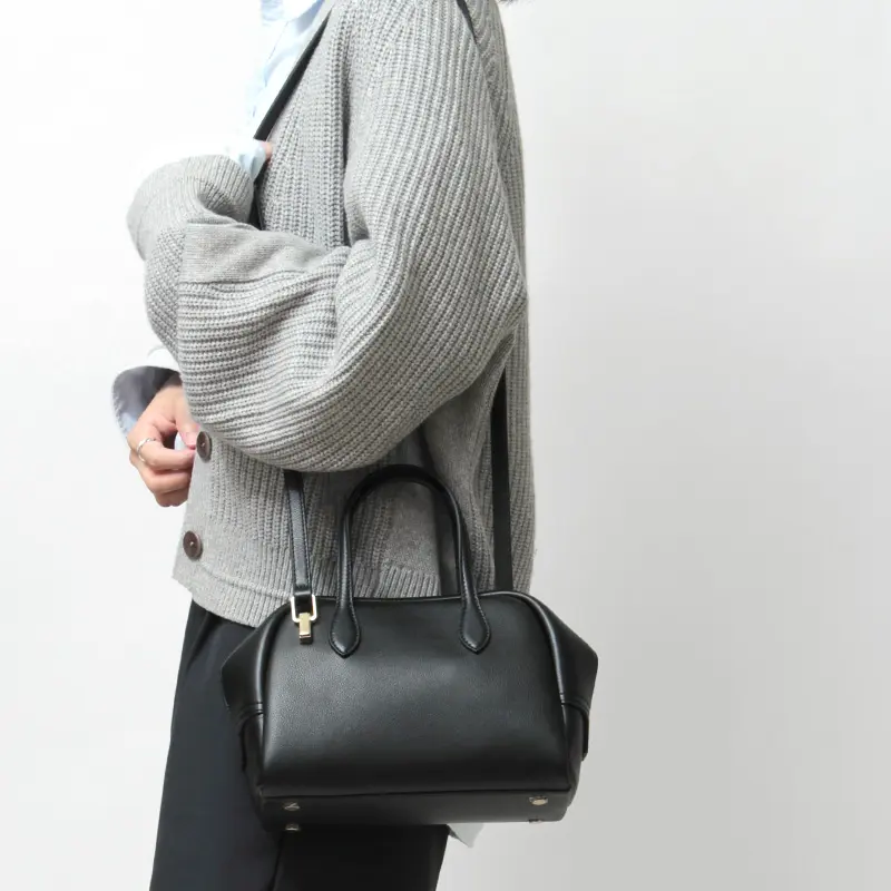 コロンとした柔らかなフォルムが可愛らしい"PUNTI.(プンティ)"の「VOYAGE」。小さなシボが特徴の、傷がつきにくい張りのあるレザーを使用したボストン型バッグ。トップの金具を留めるとフォルムに変化が生まれ、雰囲気の違いを楽しめるのも魅力のひとつ。長財布や折りたたみ傘が入る収納力と、斜めがけが可能な2way仕様で実用性も抜群。上品な佇まいは、普段使いからオケージョンまで幅広く活躍します。