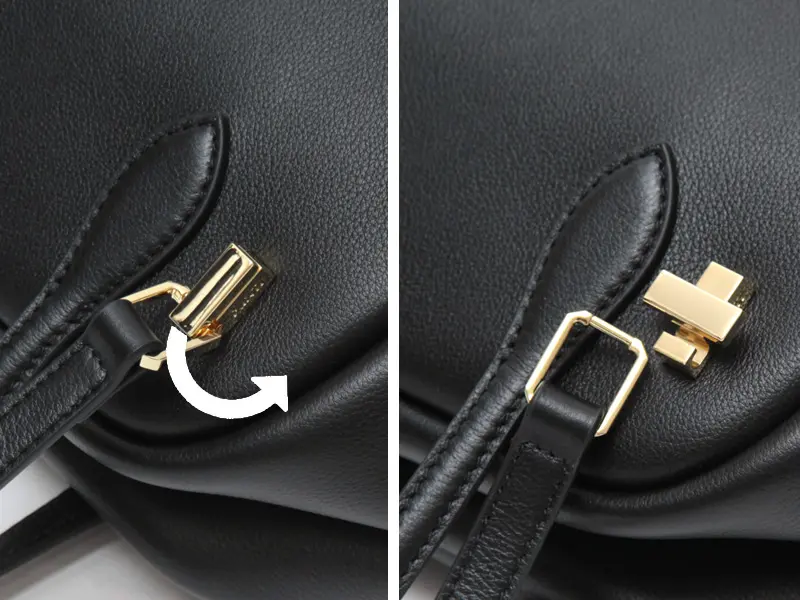 ショルダーストラップは調節、取り外し可能。矢印の方向に金具をひねると取り外すことができます。コロンとしたフォルムと、ハンドル横にあしらわれたショルダー金具がさりげなく輝き、全体を洗練された印象に仕上げています。卒入学式などのセレモニーにはもちろん、デニムと合わせた抜け感ある着こなしもおすすめです。