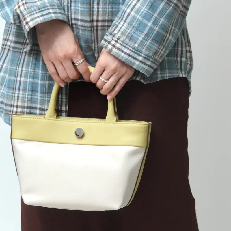 牛革×リサイクルポリエステルの異素材コンビが上品な舟形トート。カジュアルからきれいめまで幅広いスタイルに馴染み、シーンや年齢を問わず長く愛用できる一品。ミニマルなサイズが可愛らしく、アクセサリー感覚で使えるアイテムです。