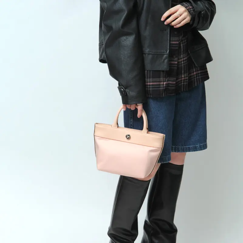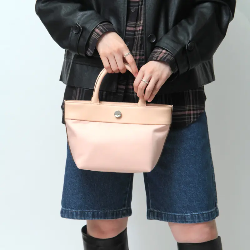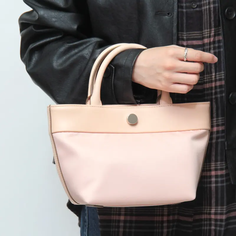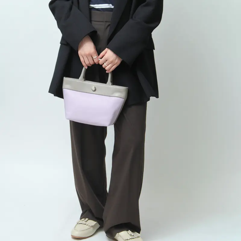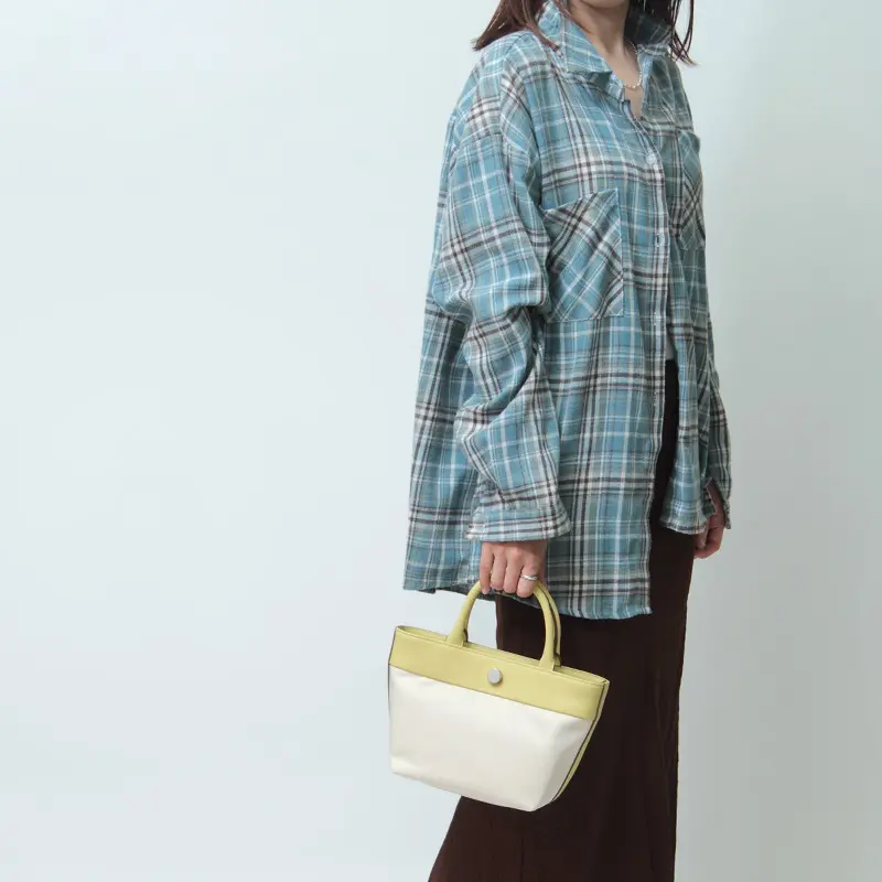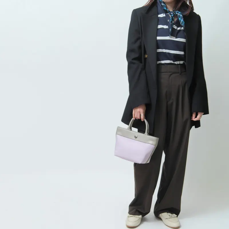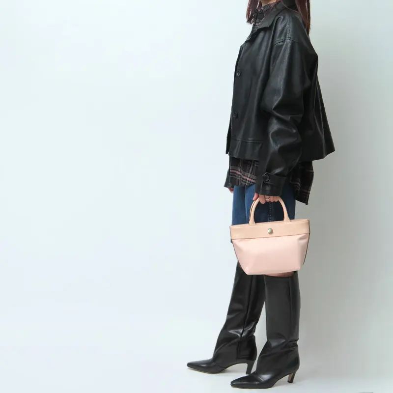 牛革×リサイクルポリエステルの異素材コンビが上品な舟形トート。カジュアルからきれいめまで幅広いスタイルに馴染み、シーンや年齢を問わず長く愛用できる一品。ミニマルなサイズが可愛らしく、アクセサリー感覚で使えるアイテムです。