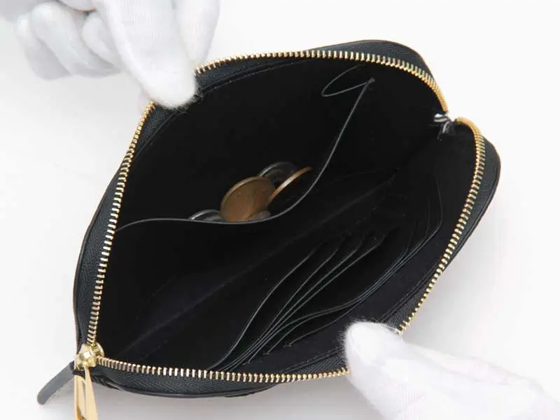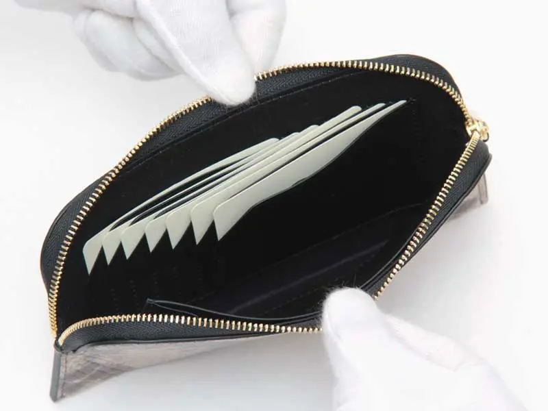開閉はファスナー仕様で、サイドまでジップが施されているので、しっかりと開きます。ファスナーを開けると、お金やカードなど中身が一度に見えるのも嬉しいポイントです。どこに何があるのかひと目で分かるので、お会計もスムーズ。薄いフォルムで、バッグの中に入れてもかさばりません。