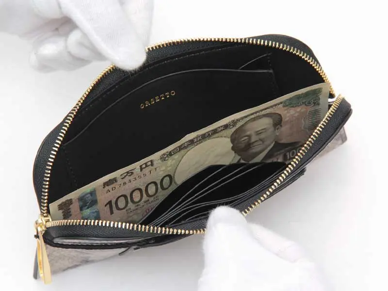 パイソン型押しを施した牛革が上品に映える"ORSETTO オルセット"の薄型長財布。お札を折らずにすっきり収納できるスマートな設計に加え、背面にはカードポケットを2つ配置。メインファスナーを開けずにICカードやよく使うカードが取り出せる利便性の高さが魅力です。かさばらないスリムなフォルムは、小さめバッグとの相性も抜群。上質さと使いやすさを兼ね備えた一品です。