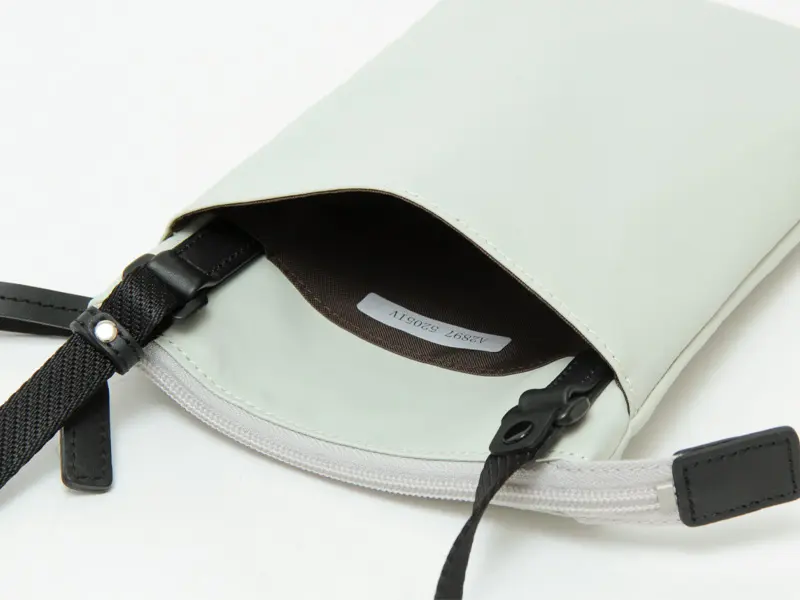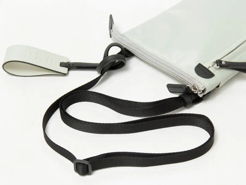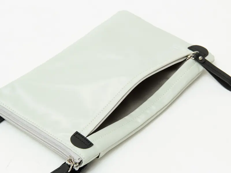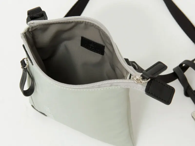 本体素材は、表面のポリウレタン部分とボリュームがありながらソフトな基布の2層から形成されており、強度に優れています。表面に繊細な絹目調のシボ加工を施しているのでセミマットで上品な光沢感があり軽量素材でも上品な印象です。水に強いので突然の雨も安心。丈夫なので扱いやすく、デイリーだけでなく、旅行やレジャーなどにも最適です。