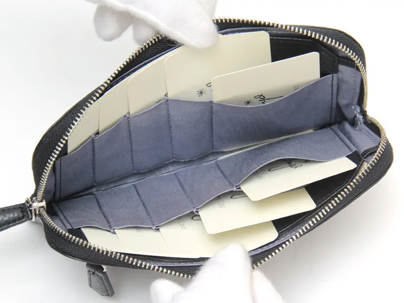 カード収納は縦型で、出し入れがスムーズ。全部で10ヶ所あり、各ポケットに2枚ずつ入れれば、20枚以上のカードを収められる大容量設計の財布です。
