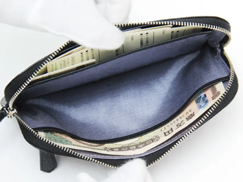 開閉はラウンドファスナー仕様。厚さ2cmのスリムなデザインで、バッグの中でもかさばらず、ポシェットなどのミニバッグにもぴったり。コンパクトながらも収納力が高く、メイン財布としてもしっかり活躍してくれます。