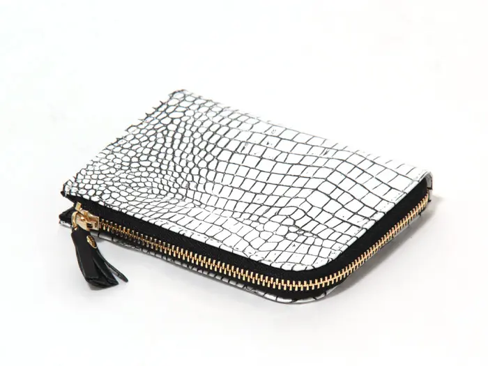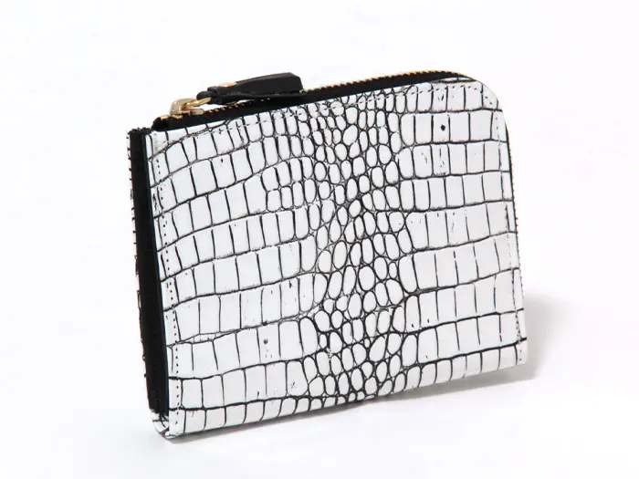 ホワイトは牛革にクロコダイル(ワニ革)の模様を模した型を型押ししています。溝の部分に色を残した染色方法で、立体感のある仕上がりです。
