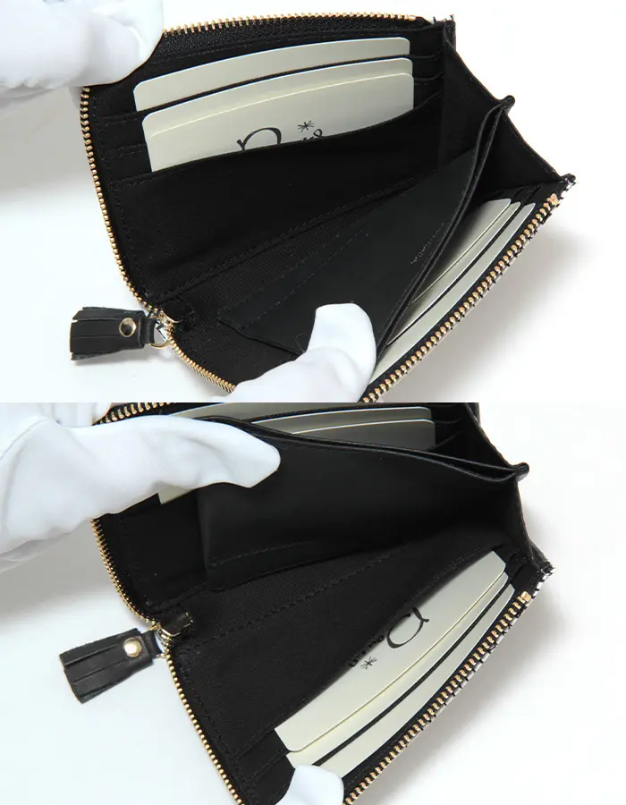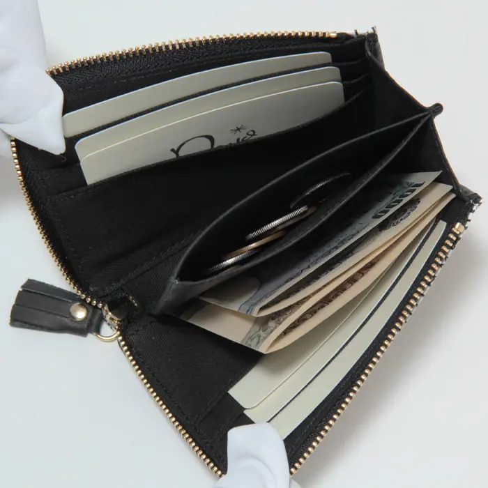 お札を二つに折って収納する仕様。小銭やカードも分けて収納できます。サイドのマチの開きが良く、大きく開くので取り出しやすい設計です。