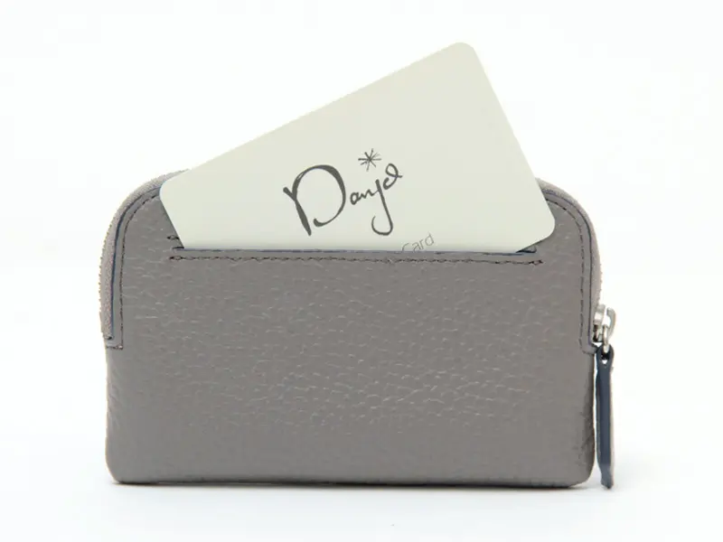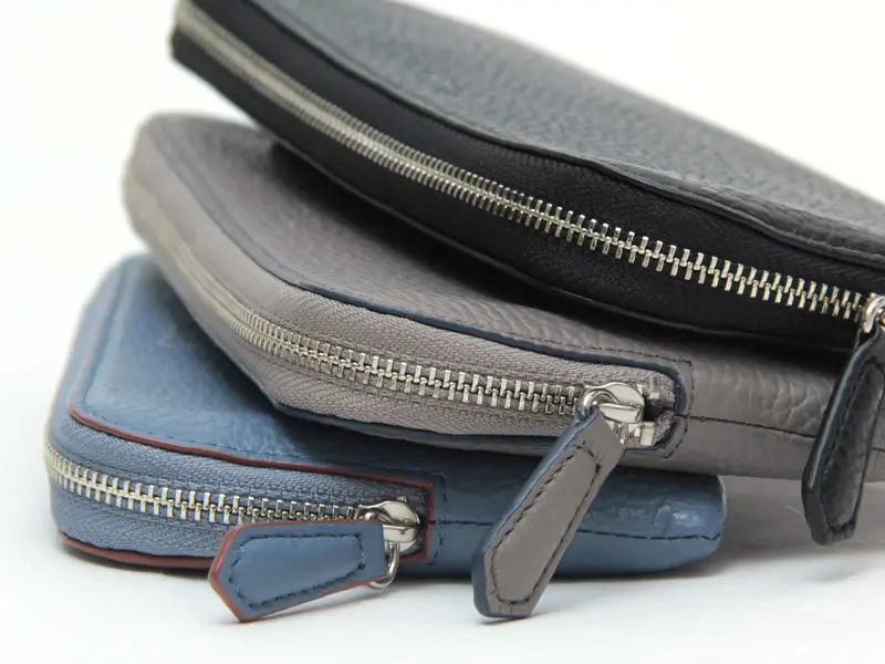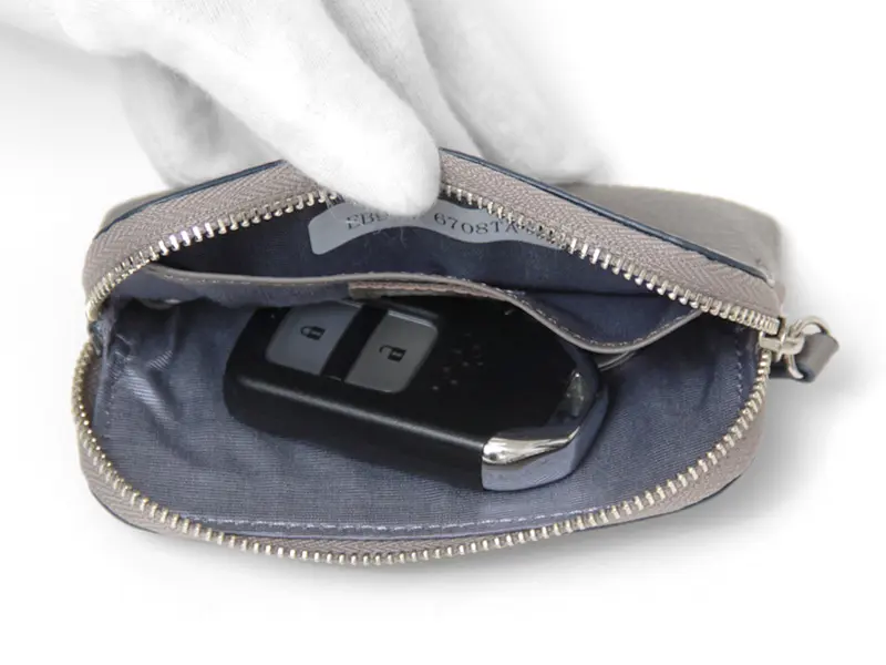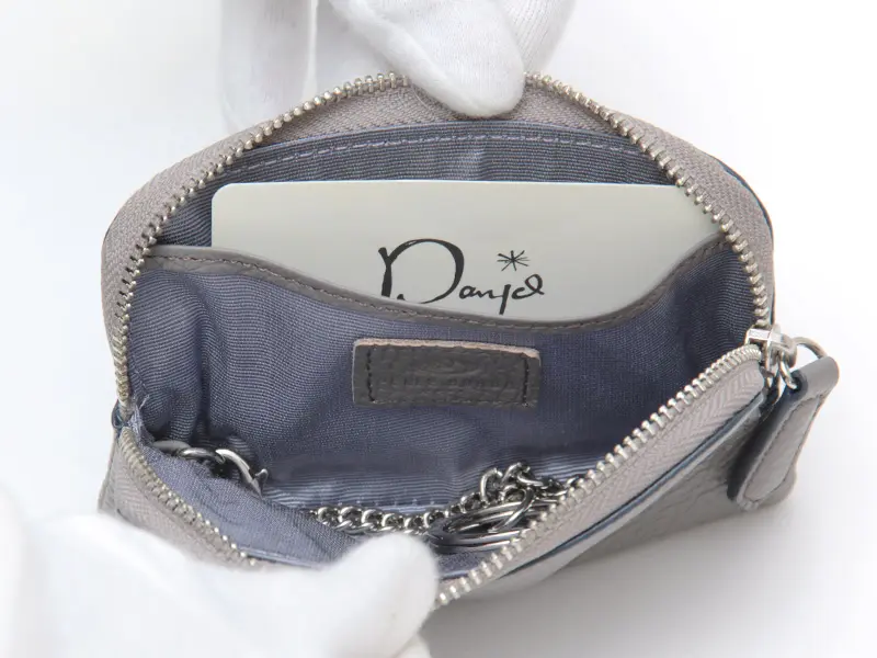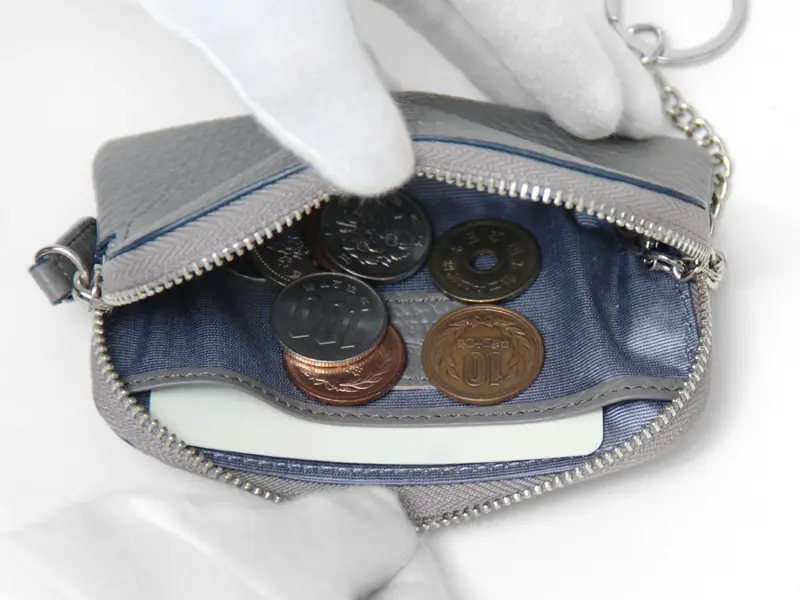 開閉はラウンドファスナー仕様。内側には取り外し可能なキーリングが付いており、車や家の鍵を付けていただけます。また、オープンポケットも付いており、鍵だけでなく小銭や免許証、カード類などを入れて持ち運べます。厚さ2cmのスリムなデザインで、ポケットやバッグの中でもかさばらず、ポシェットなどのミニバッグにも◎。