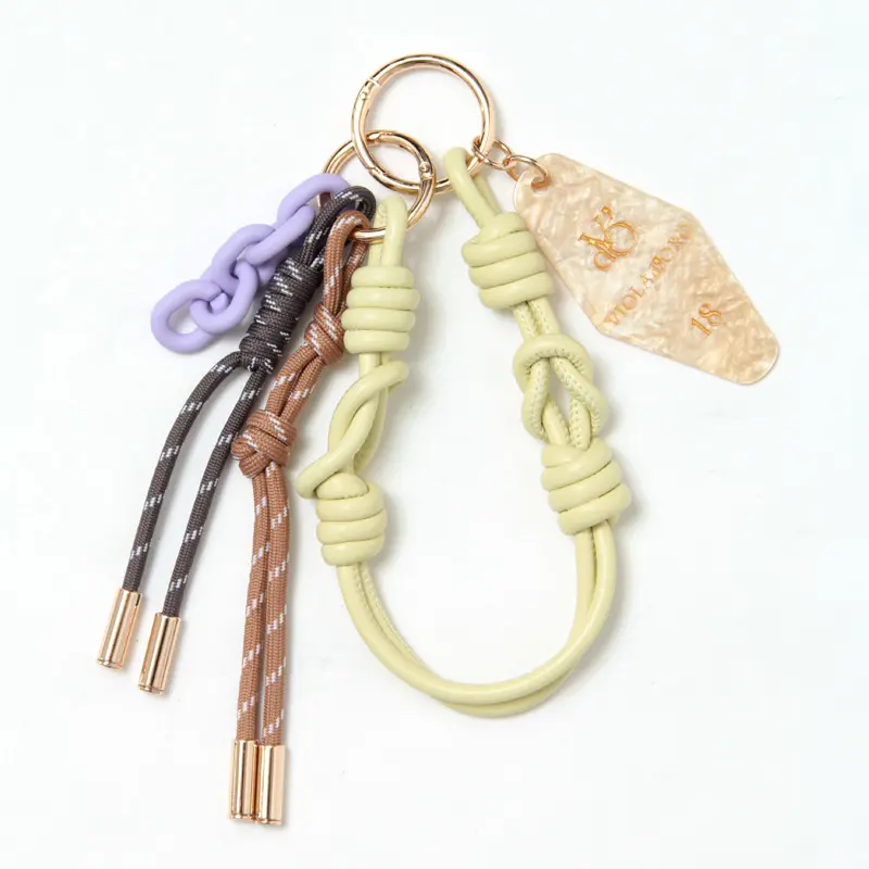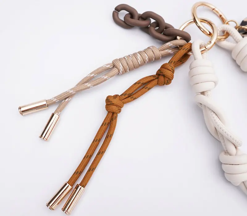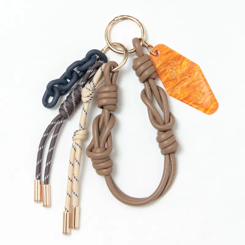 レザーコード、パラコード、プラスチックチェーン、そしてロゴ入りのアクリルパーツ。 厳選された4種類の素材が絶妙なバランスでセットされています。 驚くほど軽量な作りで、バッグのシルエットを崩さずに軽やかな彩りを添えてくれます。