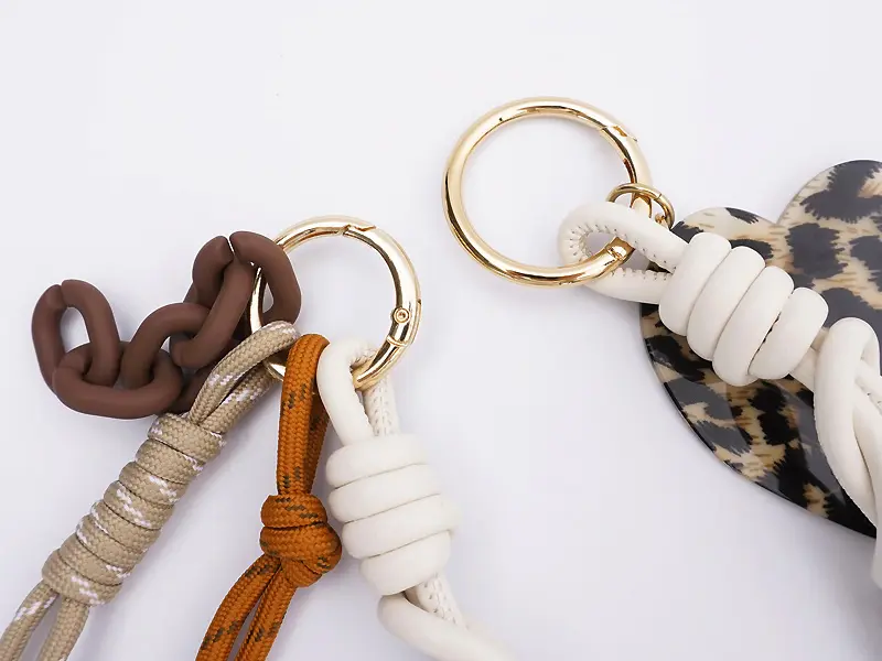 2つのゴールドリングは使い勝手の良いカラビナ仕様。 お手持ちのバッグに合わせて、取り付け位置やバランスを自由に調整いただけます。