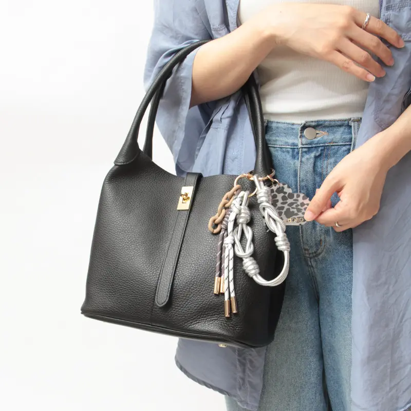 複数のチャームを重ねて、自分らしいニュアンスを加えるのが今季のスタイル。 同系色でシックにまとめれば上品な仕上がりに、差し色を選べばコーディネートの主役になる存在感を放ちます。 カッチリとしたバッグに合わせることで、程よい「抜け感」が生まれ、大人のカジュアルダウンを叶えてくれます。